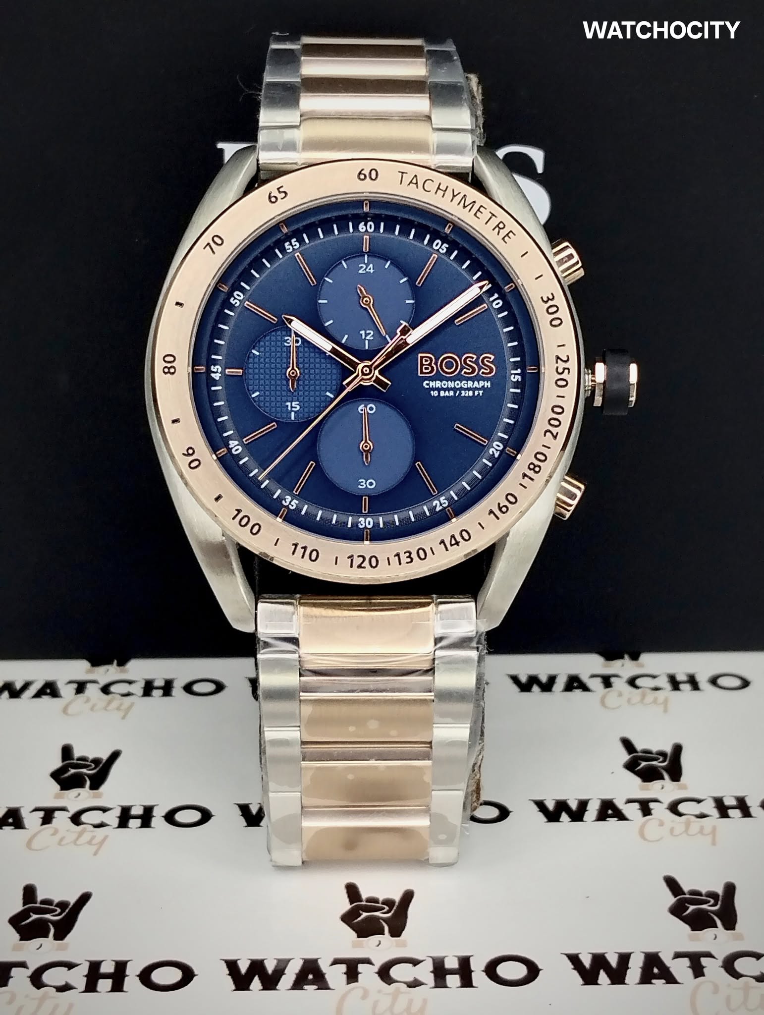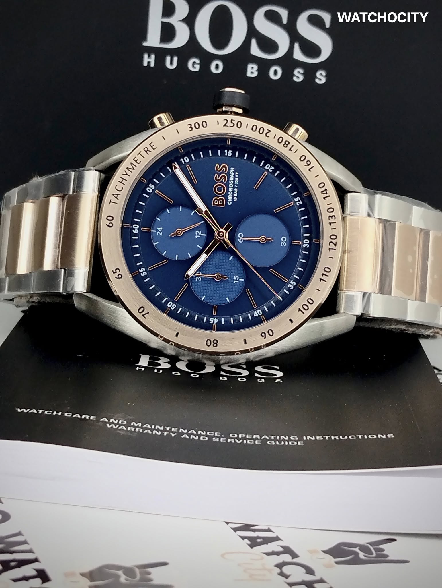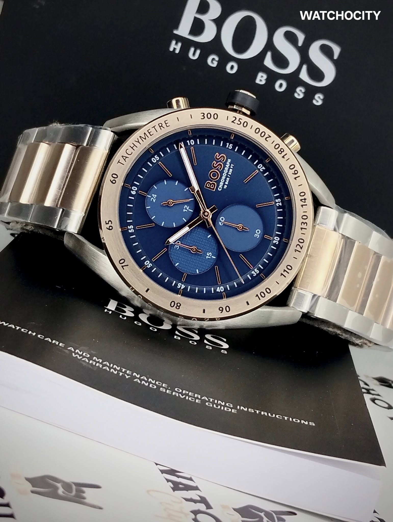 Desciption : Circle item shape , Crystal mineral dial window material type , Chronograph display type , Stainless steel case material , Push button deployment closure buckle clasp type , Stainless steel band material , Bracelet band type , Solid screw case back , Men’s standard length band length , Two-Tone band color , Blue dial color , Silver case color , Screw pull / push crown , Luminiscene hands & markers , index numerals hour markers , Minute markers around the outer rim second markers , Stainless steel bezel material , Stationary bezel function , Tachymeter outter scale , [24] Hour display function , [44]mm case diameter , [22]mm band width , [11]mm case thickness , Chronograph / Date / Hour / Minute / Second , Water resistance [5BAR] , Water resistant to [50METERS] [165FEET] in general : withstands often called divers watches & can be used for snorkeling , swimming, & other water sports , but not high board diving or sub aqua diving.