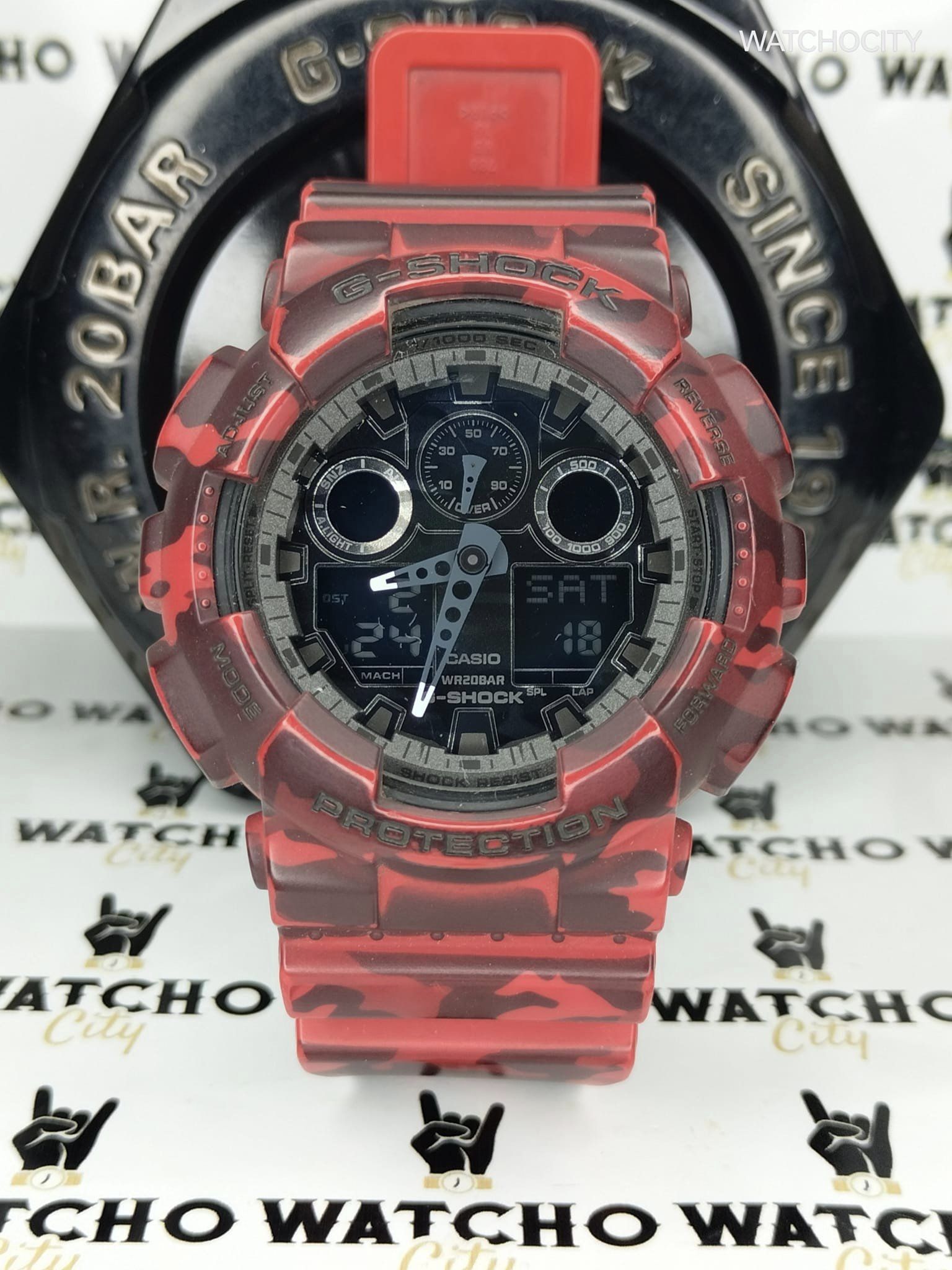 Description : Round item shape , Crystal mineral dial window material type , Ana / Digi display type , Pin closure buckle clasp type , Resin band material , Resin strap band type , Solid screw case back , Resin case material , Men’s standard band length , Red band color , Black camouflage dial color , Red case color , Pull / Push crown , Luminescent hands & index & numeral hour markers , Minute markers around the outer rim , Resin bezel material , Fix bezel , [48]mm case diameter , [12]mm case thickness , [24]mm band width , Single LED light , LED light for the face [Auto LED light, Super illuminator, selectable illumination duration 1.5 seconds or 3 seconds] , afterglow LED backlight for the digital display [Auto LED light, Super illuminator, selectable illumination duration 1.5 seconds or 3 seconds afterglow] , 5 daily alarms (with 1 snooze alarm) , Day / Date / Hour / Minute / Second , Water resistance [20ATM] , Water resistant to [200METERS] [650FEET] in general : are suitable for everyday use & can tolerate splashes but not recommended for swimming & diving. suitable for swimming or bathing .