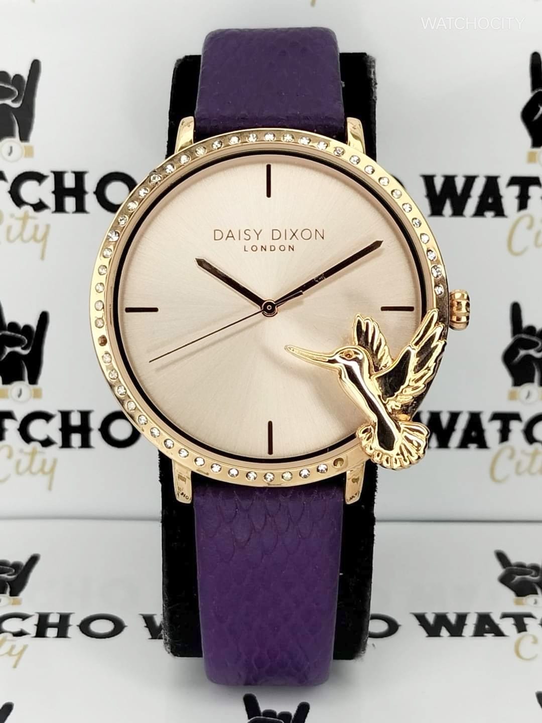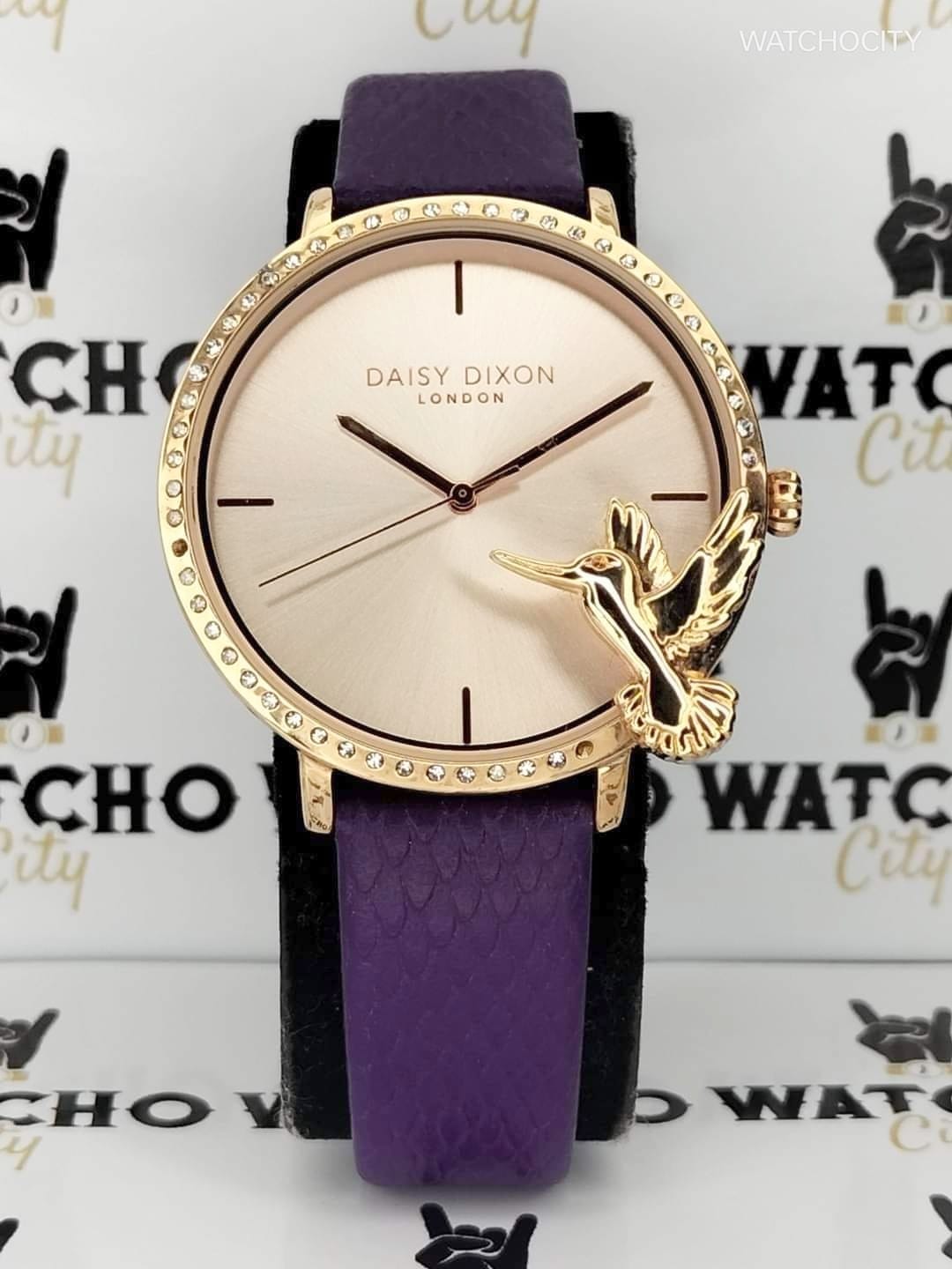 Description : Round item shape , Crystal mineral glass dial window material type , Analogue display type , Pin closure buckle clasp type , Stainless steel case material , Genuine leather band material , Strap band type , Solid case back , Women’s standard band length , Purple band color , Rose-Gold dial color , Rose-Gold case color , Pull / Push crown , Luminiscene hands & indices markers , Minute markers around the outer rim , Stainless steel bezel material , Diamond bezel , Stationary bezel , [24] Hour display function , [38]mm case diameter , [18] band width , [11]mm case thickness , Analogue / Hour / Minute / Second , Water resistance to [3ATM] , Water resistant to [30METERS] [100FEET] in general : withstands splashes or brief immersion in water , but not suitable for swimming or bathing .