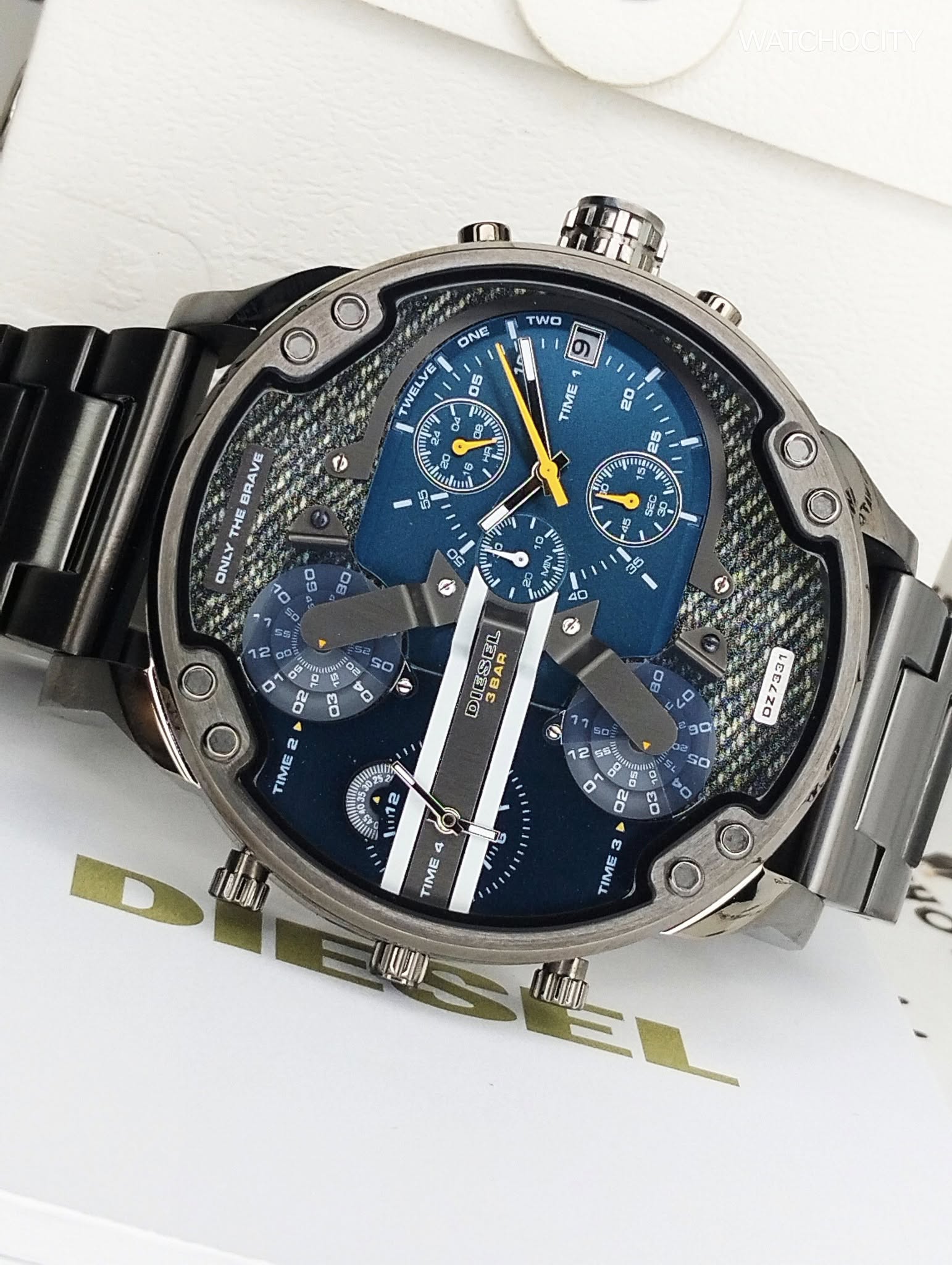 Description : Circle item shape , Crystal mineral dial window material type , Chronograph display type , Push button deployment buckle clasp type , Stainless steel band material , Bracelet band type , Screw solid case back , Stainless steel case material , Men’s standard band length , Gunmetal band color , Denim dial color , Pull / Push crown , Luminescent hands & markers , Minute markers , second time zone shown on two rotating ticks , [24] Hour display function , Stainless steel bezel material , Stationary bezel function , Fix bezel , [51]mm case diameter , [13]mm case thickness , [24]mm band width , BIG DADDY / Chronograph / Date / Hour / Minute / Second functions , Stop watch special features , Water resistance [3ATM] , Water resistant to [30METERS] [100FEET] in general : withstands splashes or brief immersion in water , but not suitable for swimming or bathing .