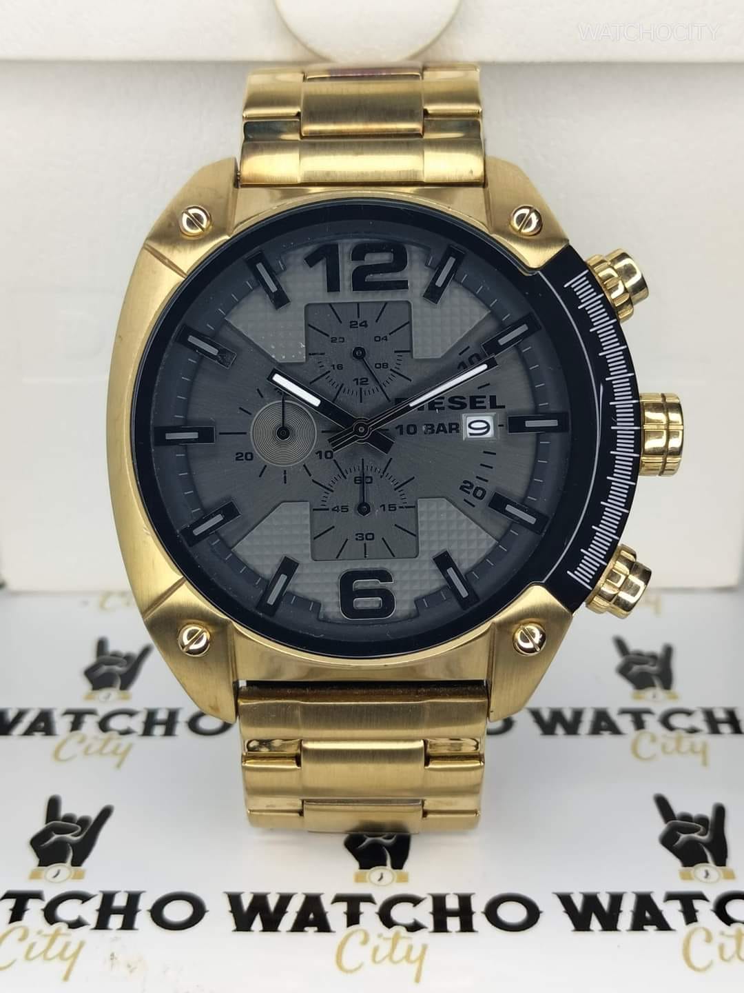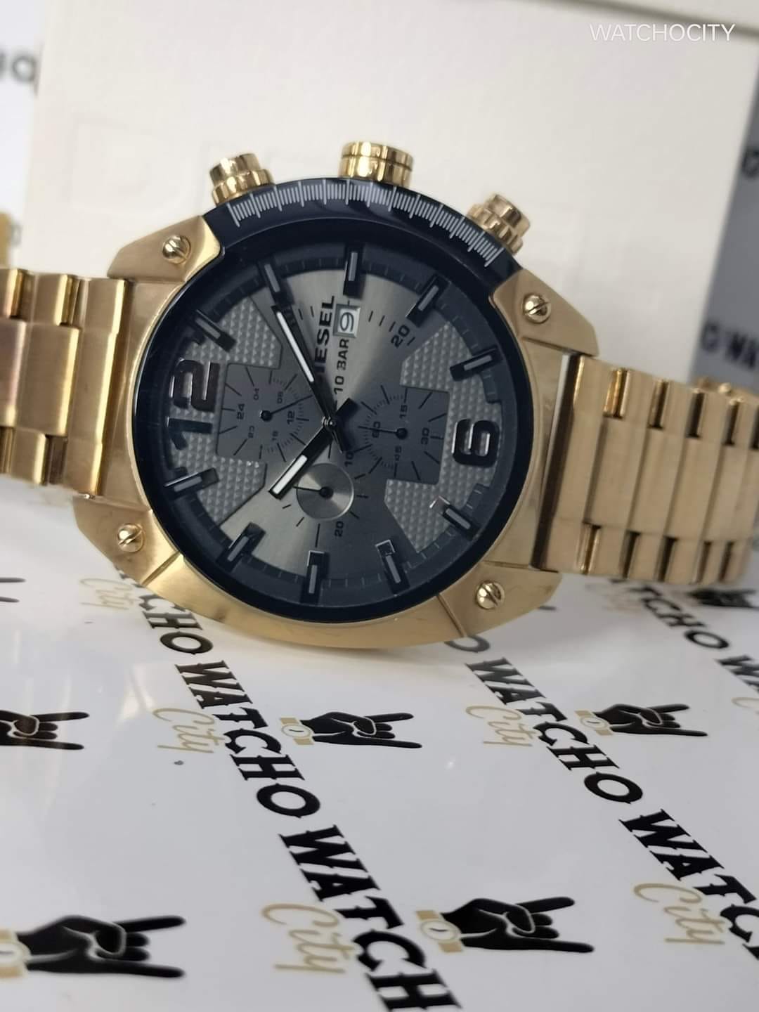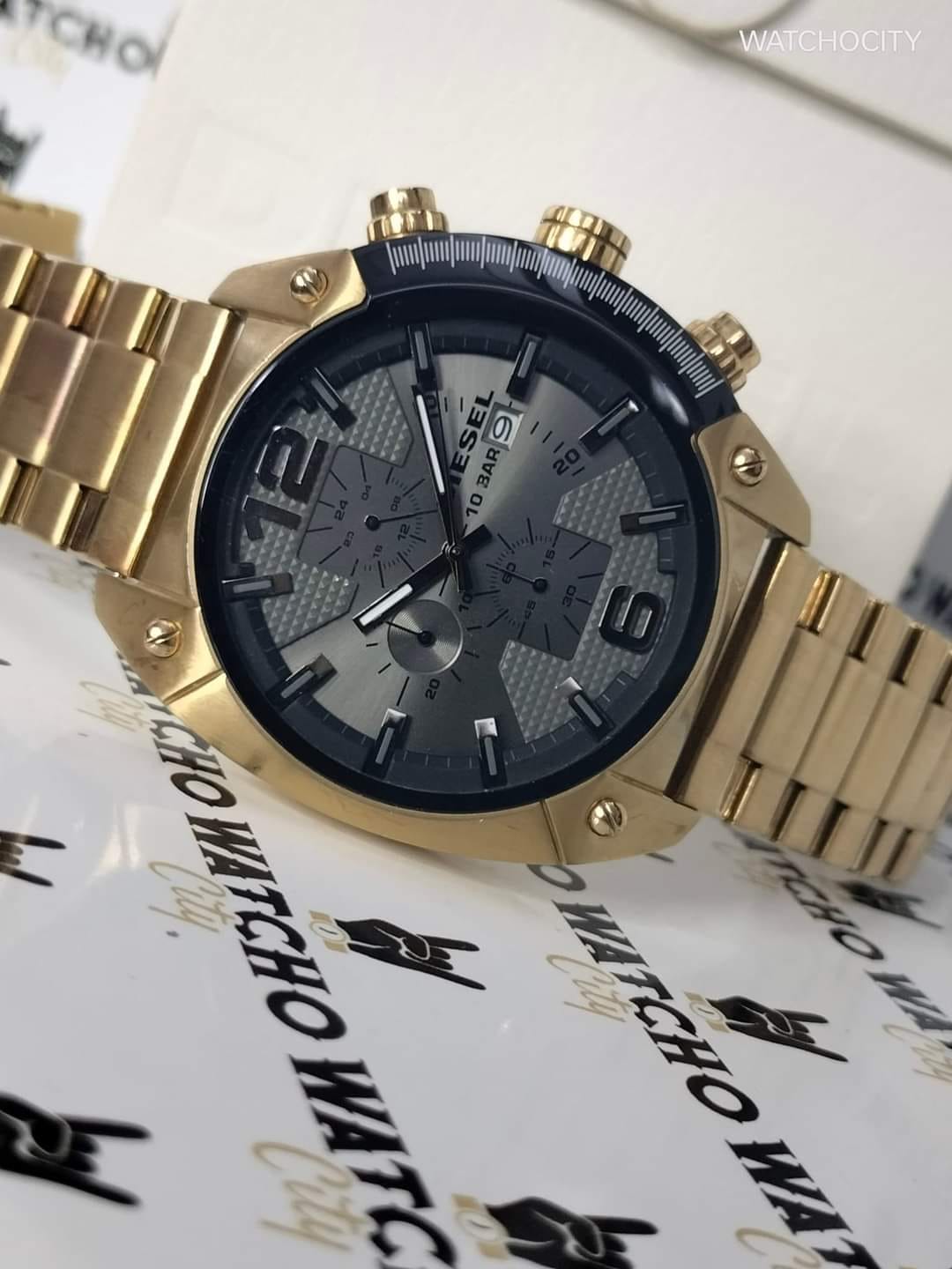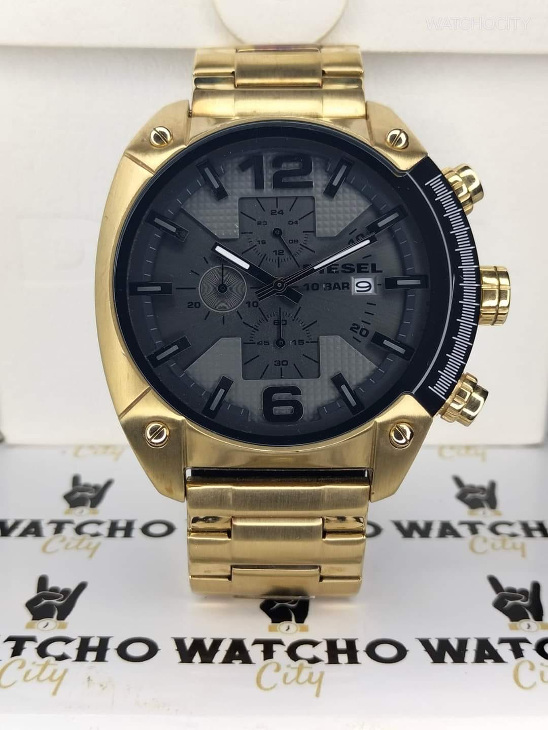 Description : Round item shape , Crystal mineral glass dial window material type , Analog display type , Push button deployment buckle clasp type , Stainless steel case material , Stainless steel band material , Bracelet band type , Solid case back , Men’s standard band length , Golden band color , Black dial color , Pull / Push crown , Luminiscene hands & markers & Arabic numerals & index dial markers , Minute markers around the outer rim , Stainless steel bezel material , Fix bezel , [24] Hour display function , [49]mm case diameter , [24]mm band width , [13]mm case thickness , Chronograph / Date / Hour / Minute / Second , Date calendar display between [4 & 5 o’clock in position] , Water resistance [10ATM] , Water resistant to [100 METERS] [330 FEET] in general , suitable for short periods of recreational swimming , but not diving or snorkeling .