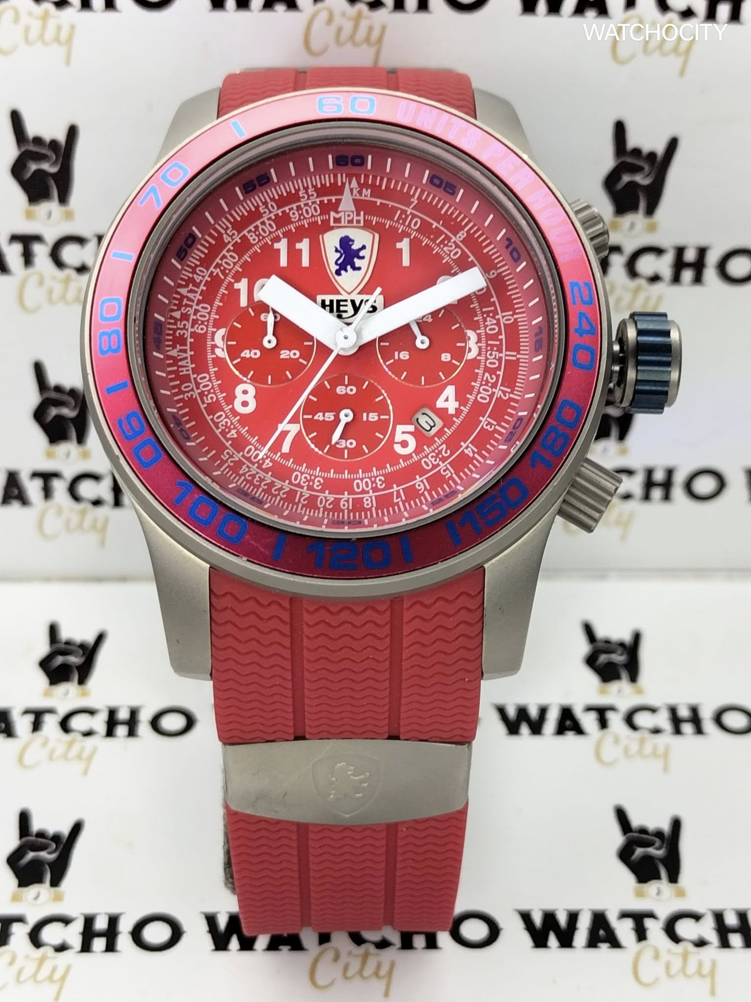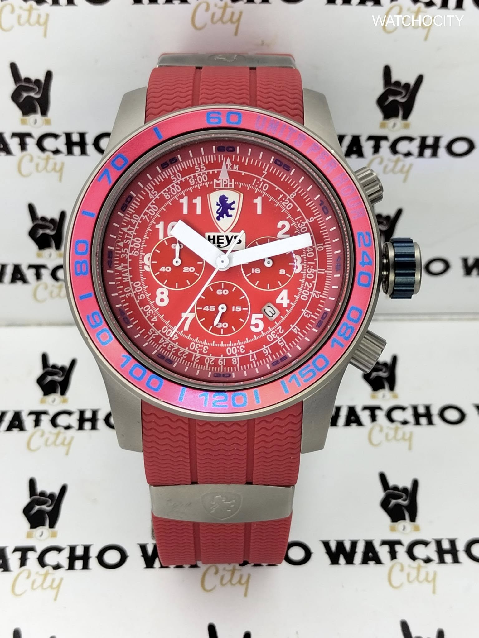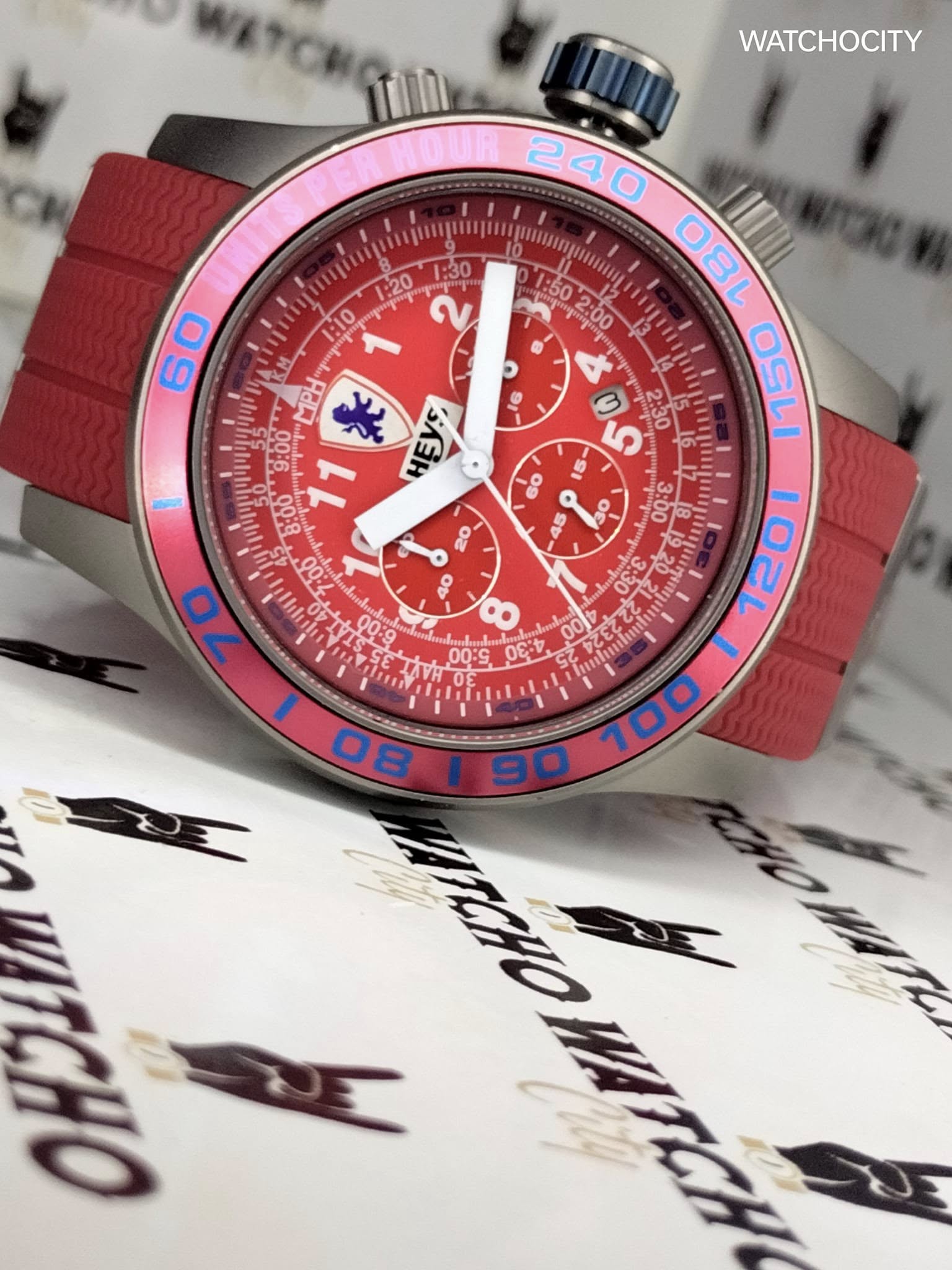 Description : Circle item shape , Crystal mineral dial window material type , Analogue display type , Pin closure buckle clasp type , Silicone band material , Rubber strap band type , Solid screw case back , Titanium case material , Men’s standard band length , Red band color , Red dial color , Grey case color , Pull / Push crown , Luminescent hands & index numeral hour markers , Minute markers around the outer rim , Titanium bezel material , Fix bezel , Tachymeter inner scale , [45]mm case diameter , [13]mm case thickness , [22]mm band width , Chronograph / Flight display / Date / Hour / Minute / Second , Date calendar display between [4 & 5 o’clock in position] , Water resistance [50ATM] , Water resistant to [500METERS] [1650FEET] in general : are suitable for everyday use & can tolerate splashes but not recommended for swimming & diving. suitable for swimming or bathing .
