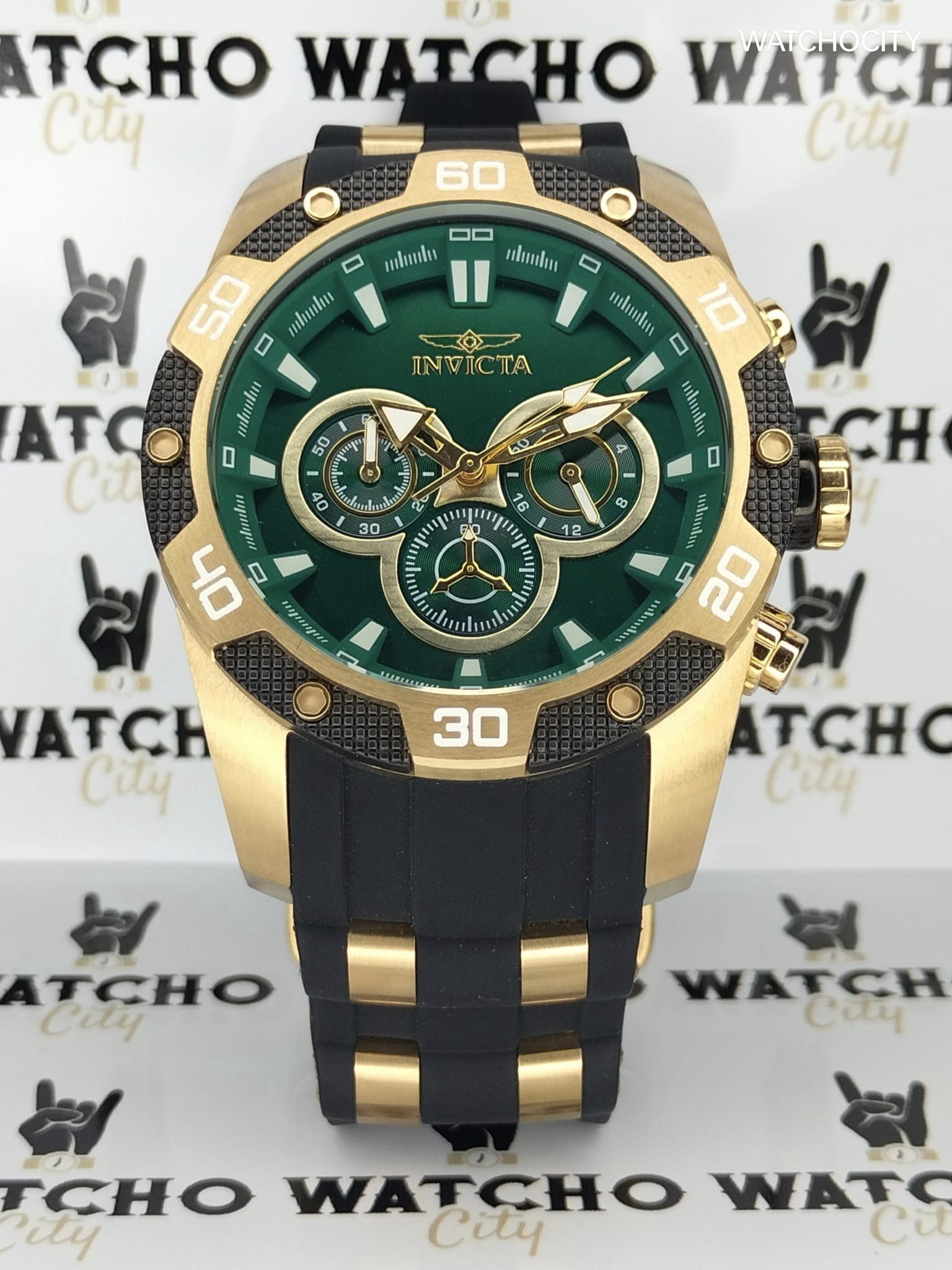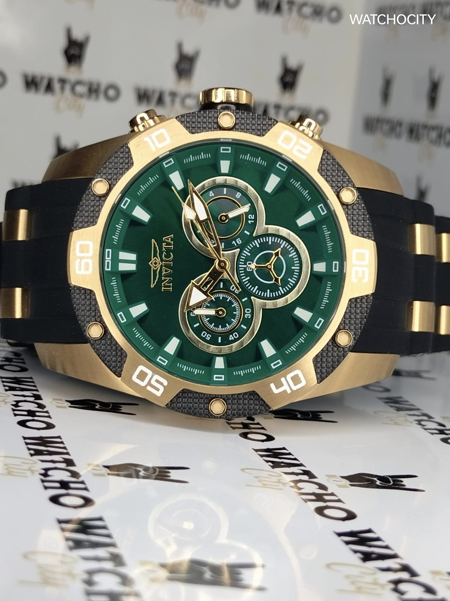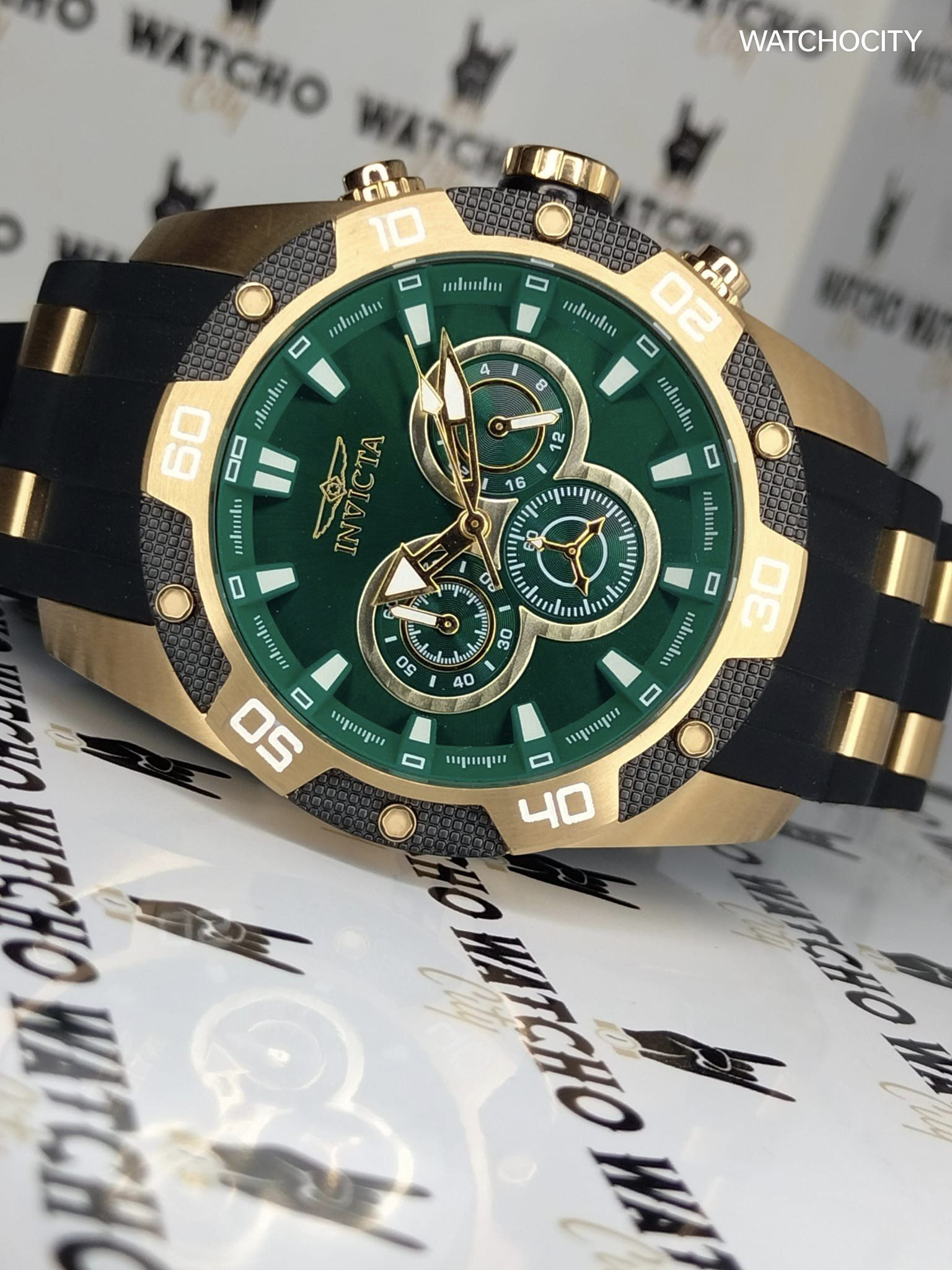 Description : Round item shape , Crystal-Flame Fusion mineral glass dial window material type , Chronograph display type , Pin closure buckle clasp type , Stainless steel case material , Silicone band material , Rubber strap band type , Screw case back , Men’s standard band length , Two-tone band color , Green dial color , Golden case color , Pull / Push crown , Luminescent markers index markings, luminescent hands , Minute markers around the outer rim , Stainless steel bezel material , Stationary bezel , [24] Hour display function , [48]mm case diameter , [26]mm band width , [19]mm case thickness , Chronograph / Date / Hour / Minute / Second , Date calendar display between [3 o’clock in position] , Water resistance [10ATM] , Water resistant to [100METERS] [330FEET] in general , suitable for short periods of recreational swimming , but not diving or snorkeling .