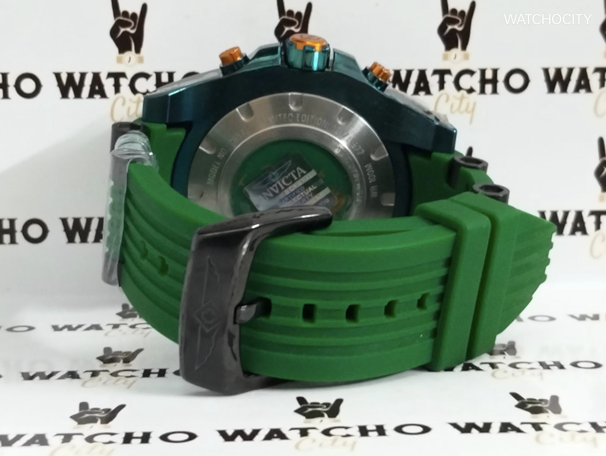 Description : Round item shape , Crystal-Flame Fusion mineral glass dial window material type , Chronograph display type , Pin closure buckle clasp type , Stainless steel case material , Silicone band material , Rubber band type , Screw case back , Men’s standard band length , Green band color , Green dial color , Green case color , Pull / Push crown , Luminescent markers index markings, luminescent hands , Minute markers around the outer rim , Stainless steel bezel material , Stationary bezel , [24] Hour display function , [52]mm case diameter , [26]mm band width , [17]mm case thickness , STAR WARS / Limited Edition / Chronograph / Hour / Minute / Second , Water resistance [10ATM] , Water resistant to [100METERS] [330FEET] in general , suitable for short periods of recreational swimming , but not diving or snorkeling .