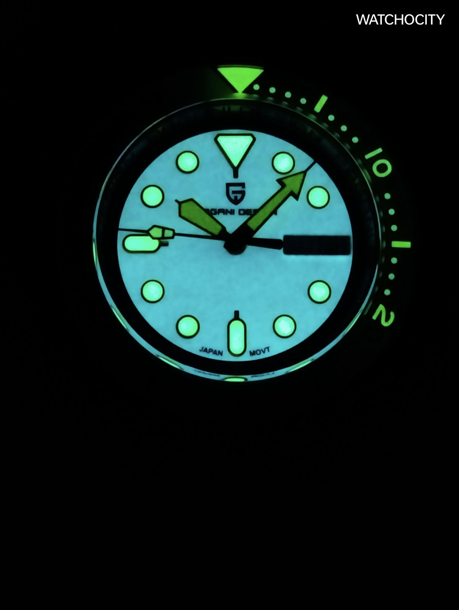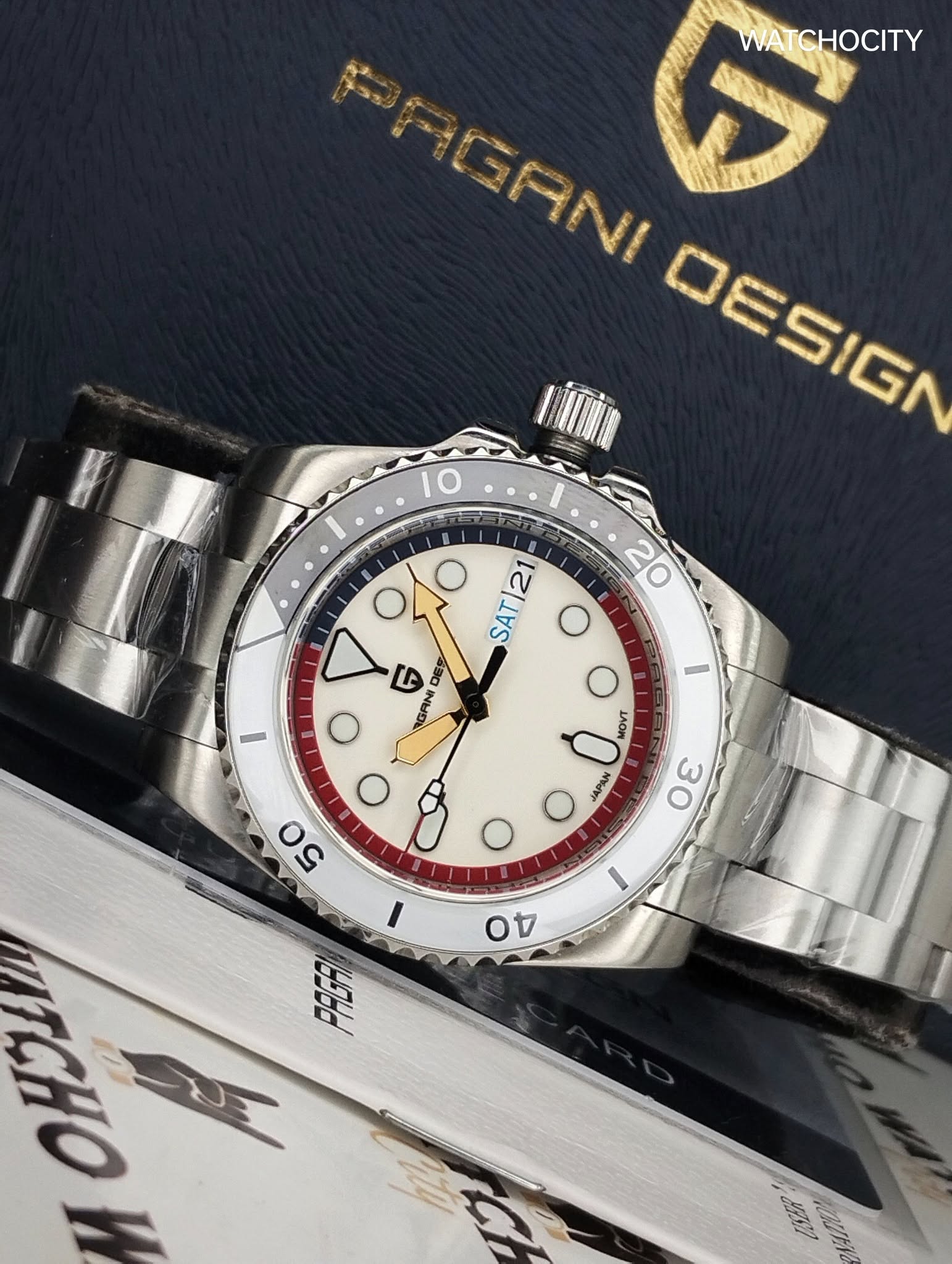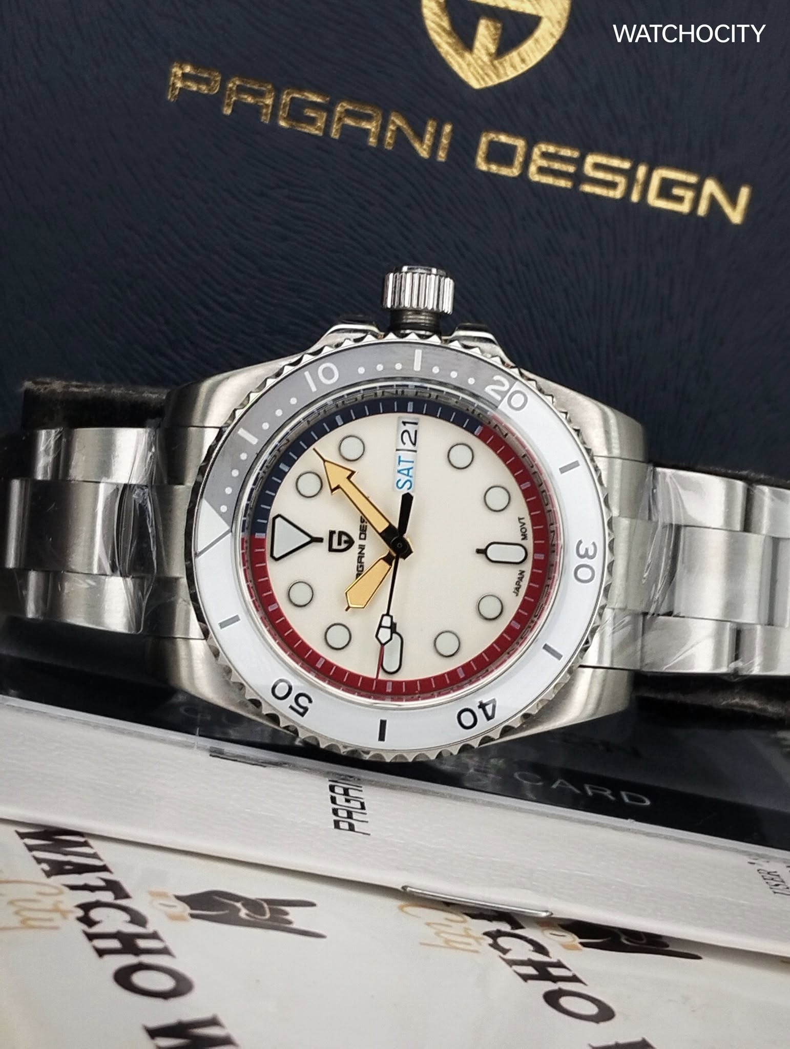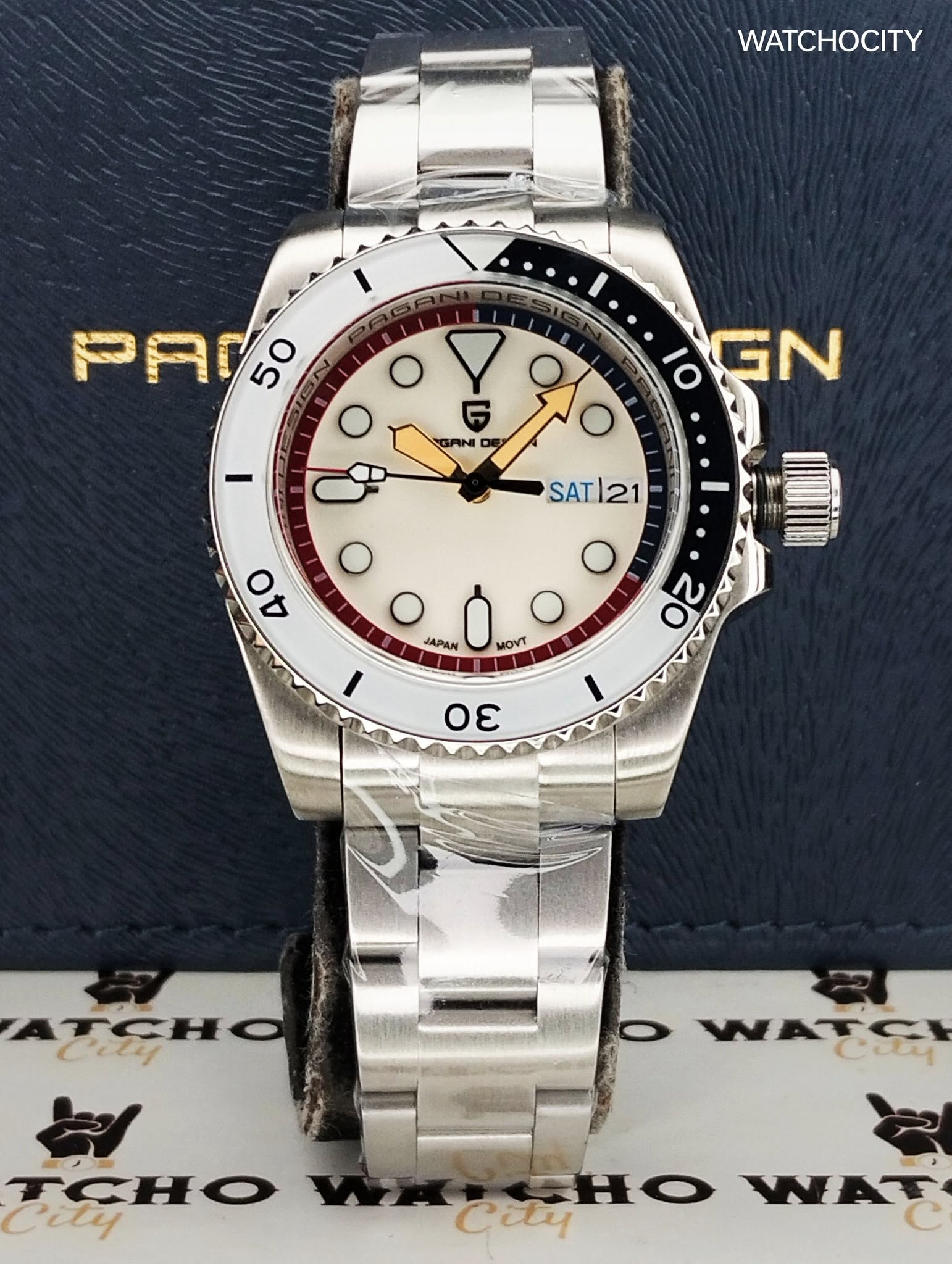Description : Circle item shape , Crystal mineral dial window material type , Automatic display type , Push button deployment clasp buckle type , Stainless steel band material , Jubilee bracel band type , Solid screw case back , Stainless steel case material , Men’s standard band length , Silver band color , Multi dial color , Silver case color , Pull / Push crown , Luminiscence hands & index dial markers , Minute markers around the outer rim , [24] Hour display function , Stainless steel bezel material , Stationary bezel function , [42]mm case diameter , [12]mm case thickness , [20]mm band width , PAGANI DESIGN / Automatic / Date / Hour / Minute / Second Functions , Date calendar display between [3 o’clock in position] , Water resistance [10ATM] , Water resistant to [100METERS] [330FEET] in general : withstands splashes or brief immersion in water , but not suitable for swimming or bathing .