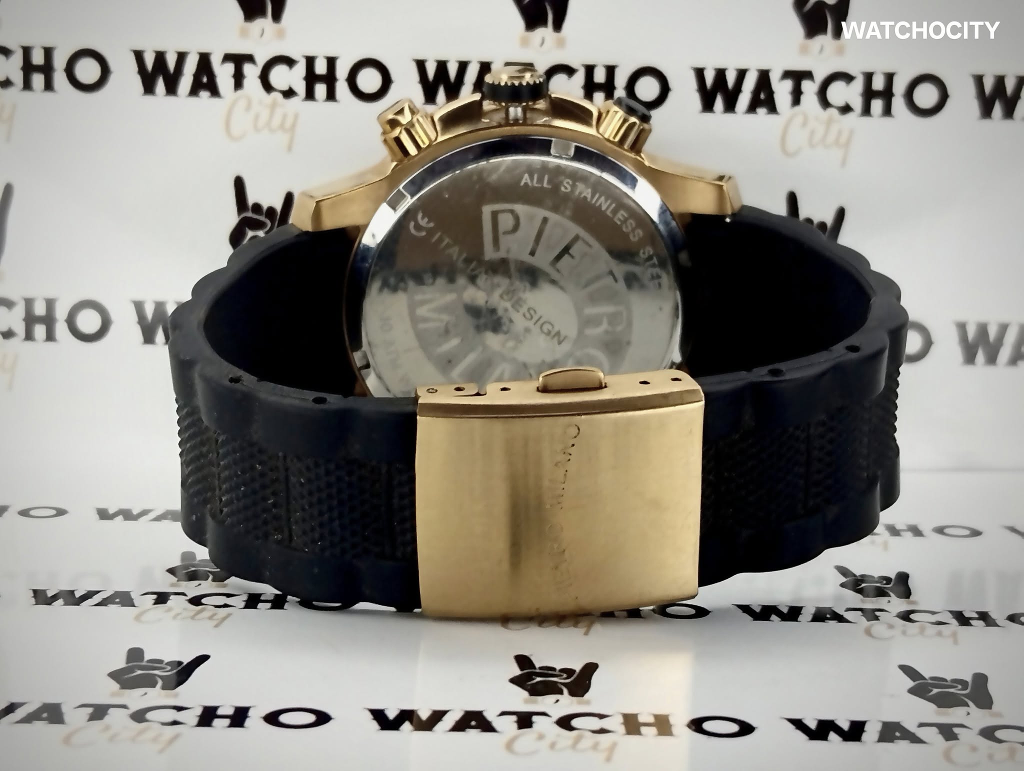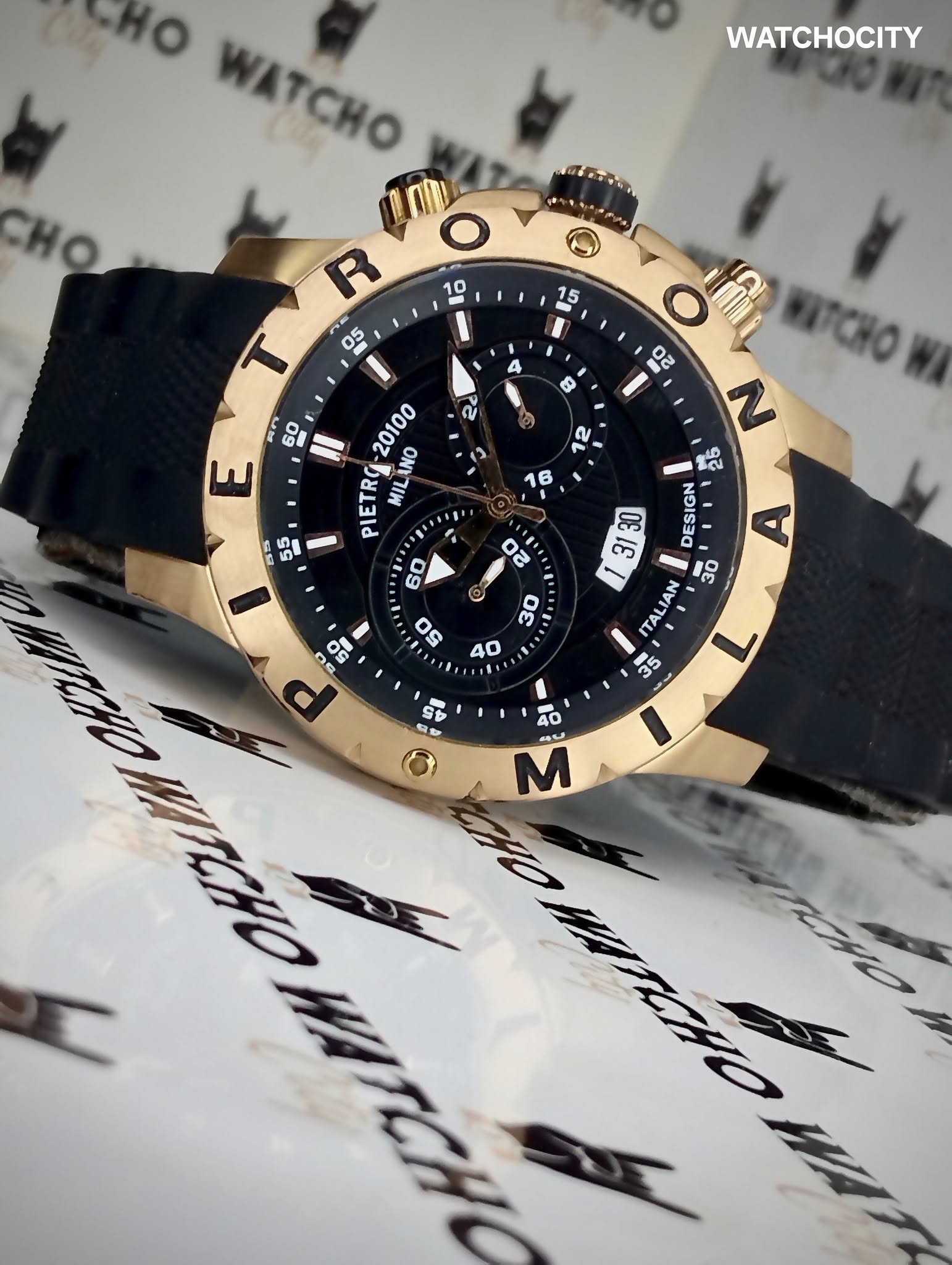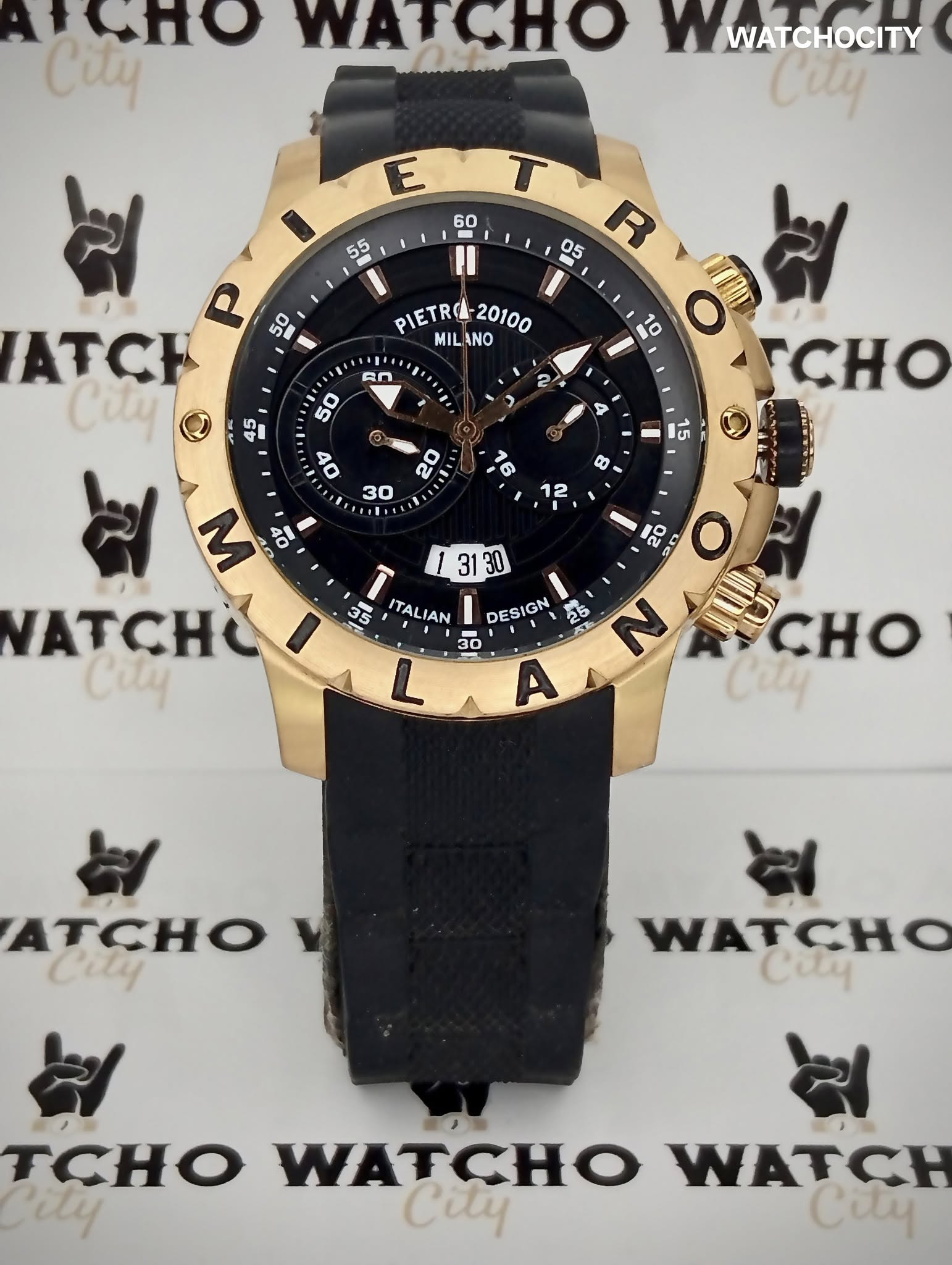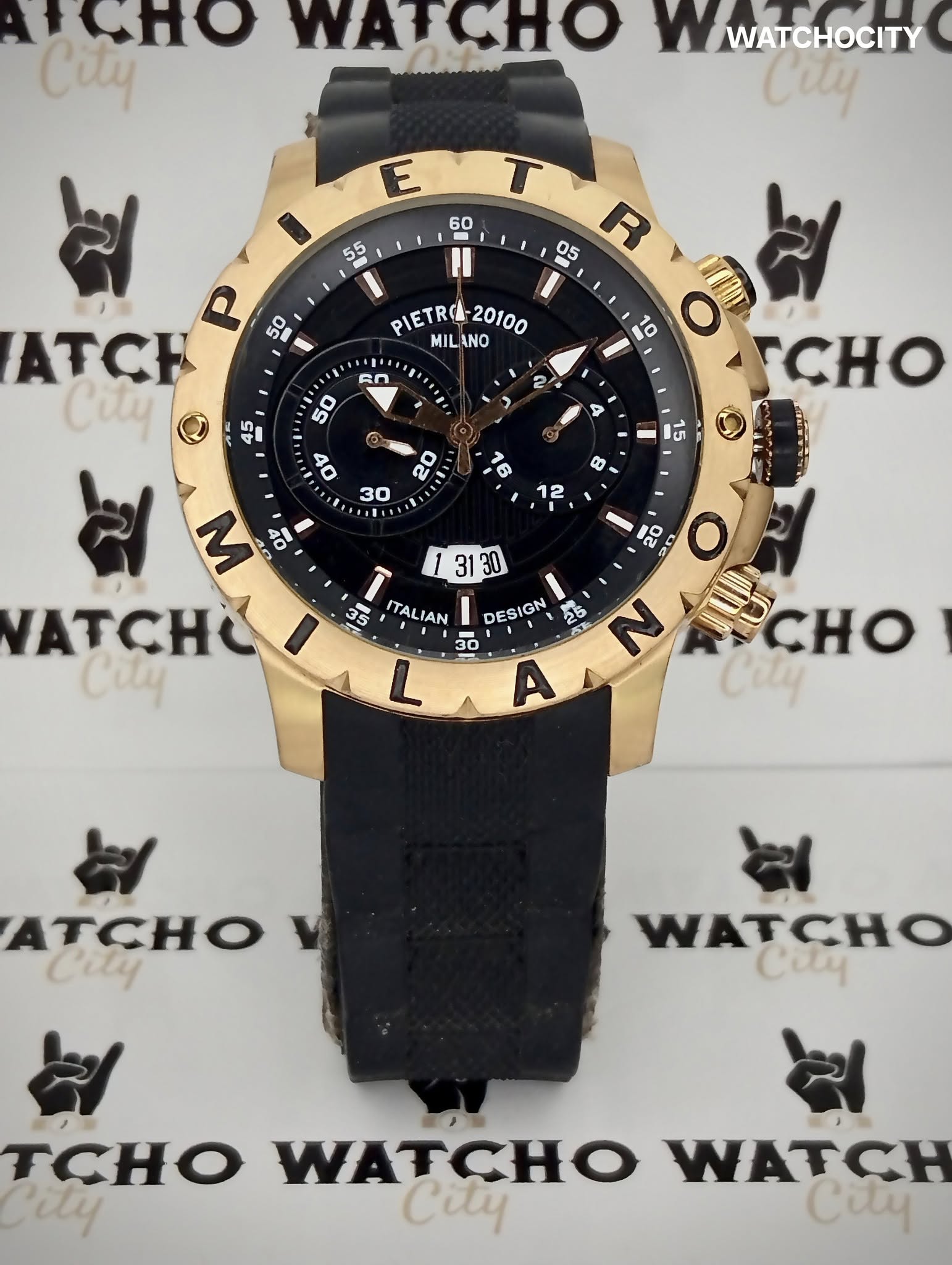Description : Circle item shape , Crystal mineral dial window material type , Analog display type , Pin closure clasp type , Silicone Rubber band material , Strap band type , Solid case back , Stainless steel case material , Men’s standard band length , Rose-Gold case color , Black band color , Black dial color , Pull / Push crown , Luminiscence hands & romans numberal & index dial markers , Minute markers around the outer rim , [24] Hour display function , Stainless steel bezel material , Stationary bezel function , [46]mm case diameter , [13]mm case thickness , [24]mm band width , Italian / Chronograph / Date / Hour / Minute / Second , Date calendar display between [6 o’clock in position] , Water resistance [5ATM] , Water resistant to [50METERS] [165FEET] in general : withstands splashes or brief immersion in water , but not suitable for swimming or bathing .