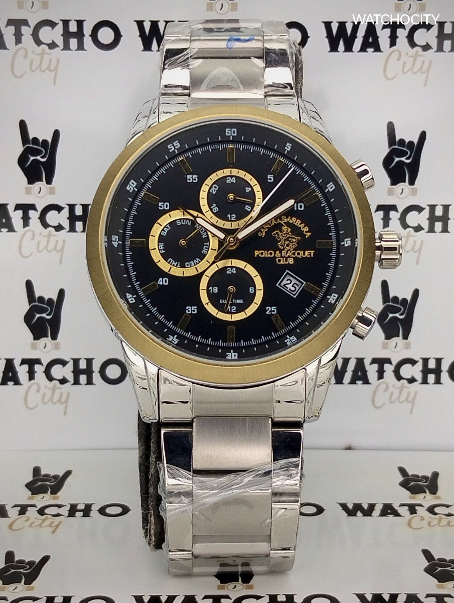 Description : Circle item shape , Crystal mineral dial window material type , Chronograph display type , Push button deployment buckle clasp type , Stainless steel band material , Bracelet band type , Solid case back , Stainless steel case material , Men’s standard band length , Silver band color , Black dial color , Silver case color , Pull / Push crown , Luminiscence hands & index dial markers , Minute markers around the outer rim , [24] Hour display function , Stainless steel bezel material , Stationary bezel function , [44]mm case diameter , [12]mm case thickness , [22]mm band width , SANTA BARBARA / Cosmograph / Date / Hour / Minute / Second Functions , Date calendar display between [4 & 5 o’clock in position] , Water resistance [5ATM] , Water resistant to [50METERS] [165FEET] in general : withstands splashes or brief immersion in water , but not suitable for swimming or bathing .