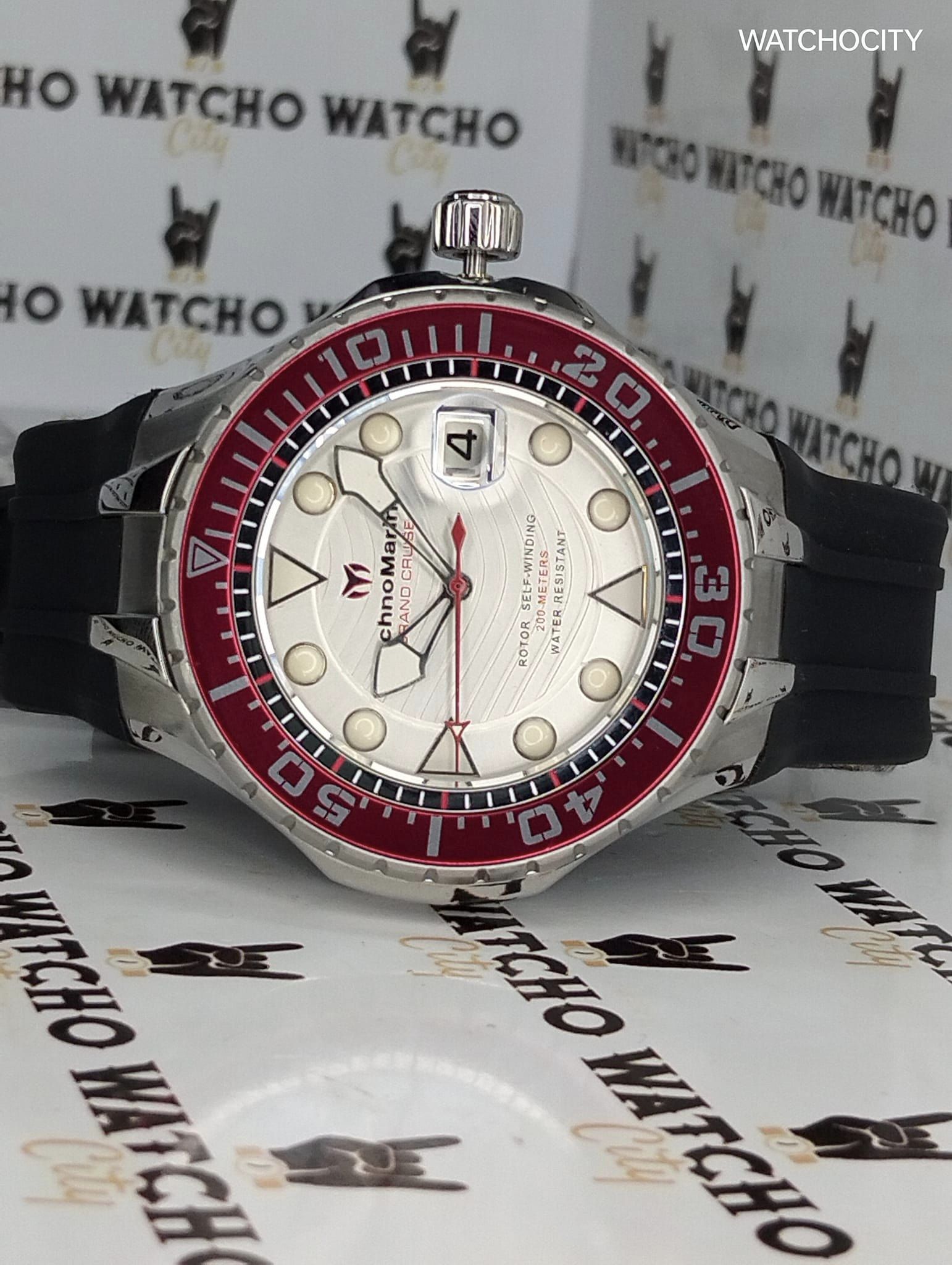 Description : Circle item shape , Crystal-Flame fusion mineral dial window material type , Automatic display type , Pin closure buckle clasp type , Silicone band material , Strap band type , Solid case back , Stainless steel case material , Men’s standard band length , Black band color , White dial color , Silver case color , Pull / Push crown , Luminiscence hands & dots numberal & index dial markers , Minute markers around the outer rim , [24] Hour display function , Stainless steel bezel material , Unidirectional bezel function , [48]mm case diameter , [13]mm case thickness , [27]mm band width , TECHNOMARINE CRUISE / Automatic / Date / Hour / Minute / Second Functions , Date calendar display between [3 o’clock in position] , Water resistance [20ATM] , Water resistant to [200METERS] [660FEET] in general : withstands splashes or brief immersion in water , but not suitable for swimming or bathing .