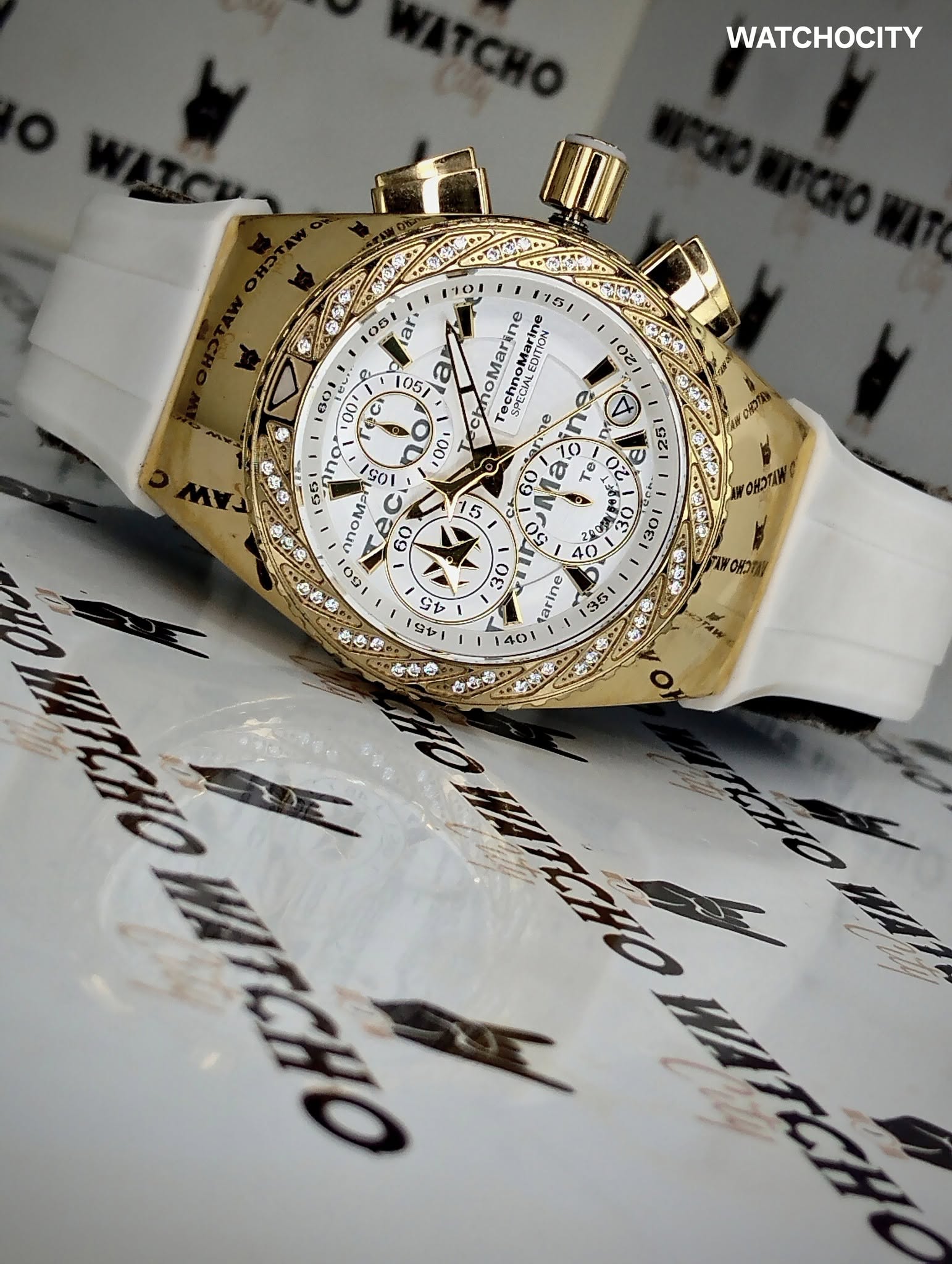 Description : Circle item shape , Crystal-Flame fusion mineral dial window material type , Chronograph display type , Pin closure buckle clasp type , Silicone band material , Strap band type , Solid case back , Stainless steel case material , Men’s standard band length , White band color , White dial color , Gold case color , Pull / Push crown , Luminiscence hands & dots numberal & index dial markers , Minute markers around the outer rim , [24] Hour display function , Stainless steel bezel material , Unidirectional bezel function , [40]mm case diameter , [13]mm case thickness , [27]mm band width , TECHNOMARINE CRUISE GLITZ / Date / Hour / Minute / Second Functions , Date calendar display between [4 & 5 o’clock in position] , Water resistance [20ATM] , Water resistant to [200METERS] [660FEET] in general : withstands splashes or brief immersion in water , but not suitable for swimming or bathing .