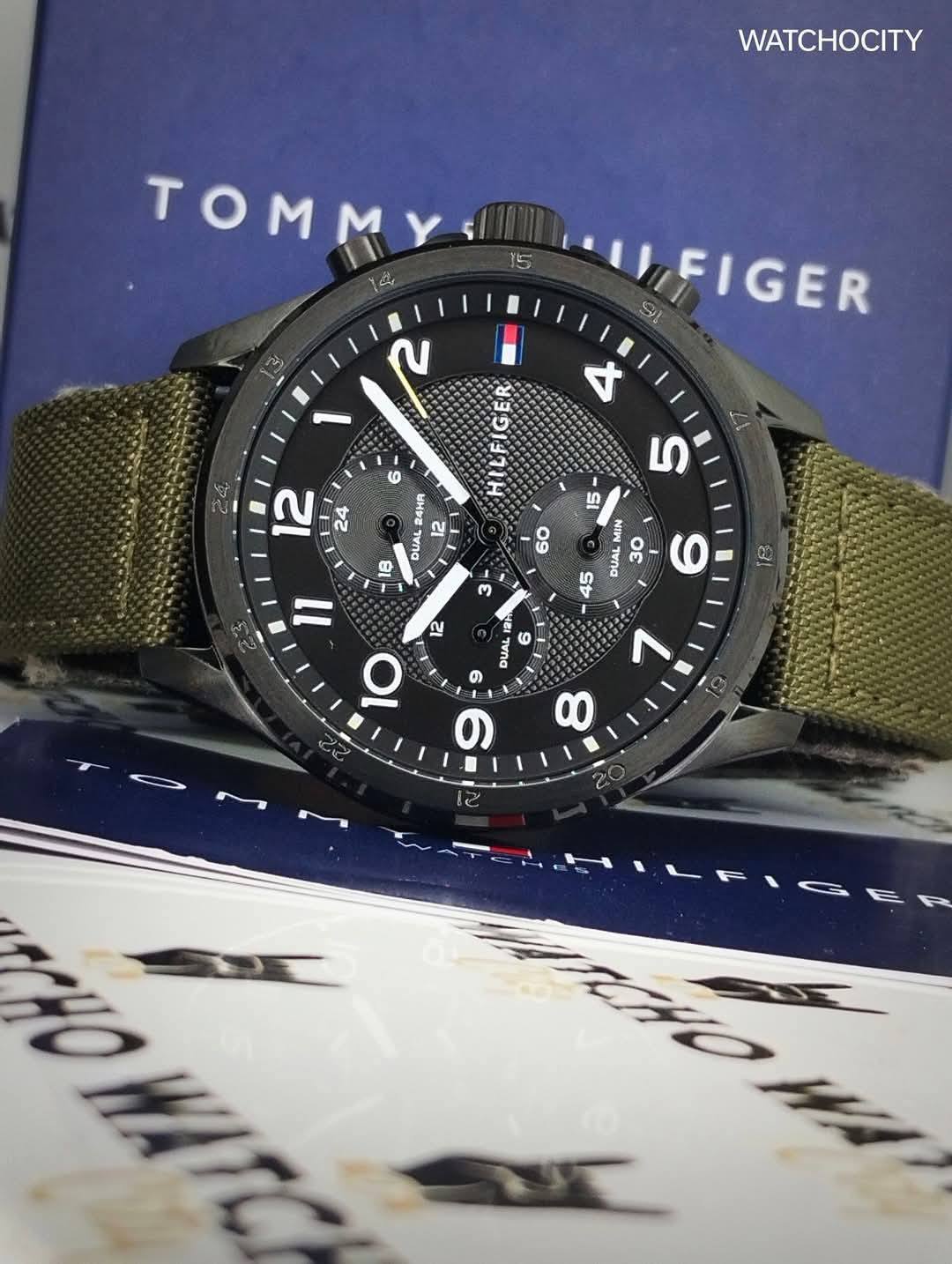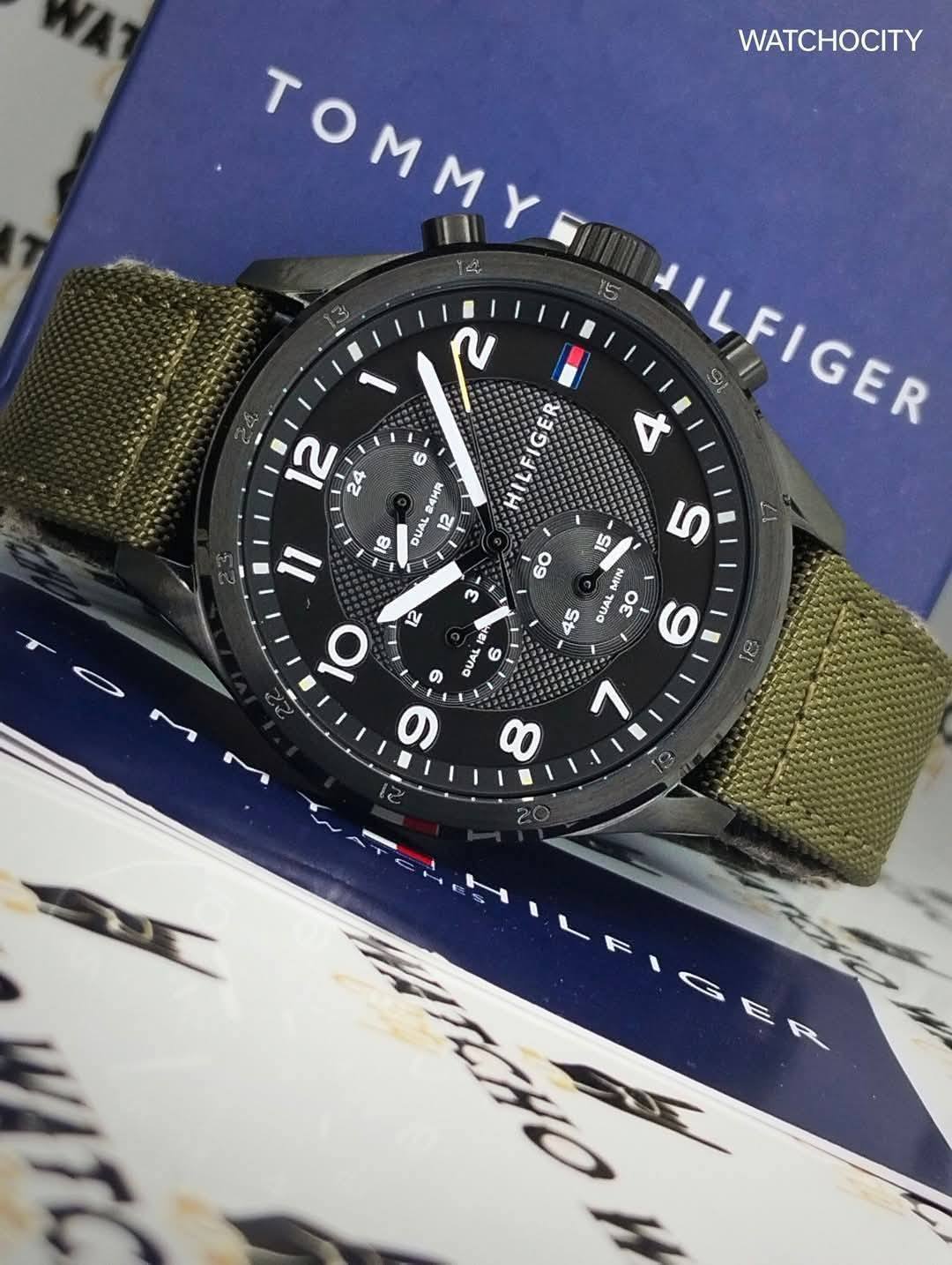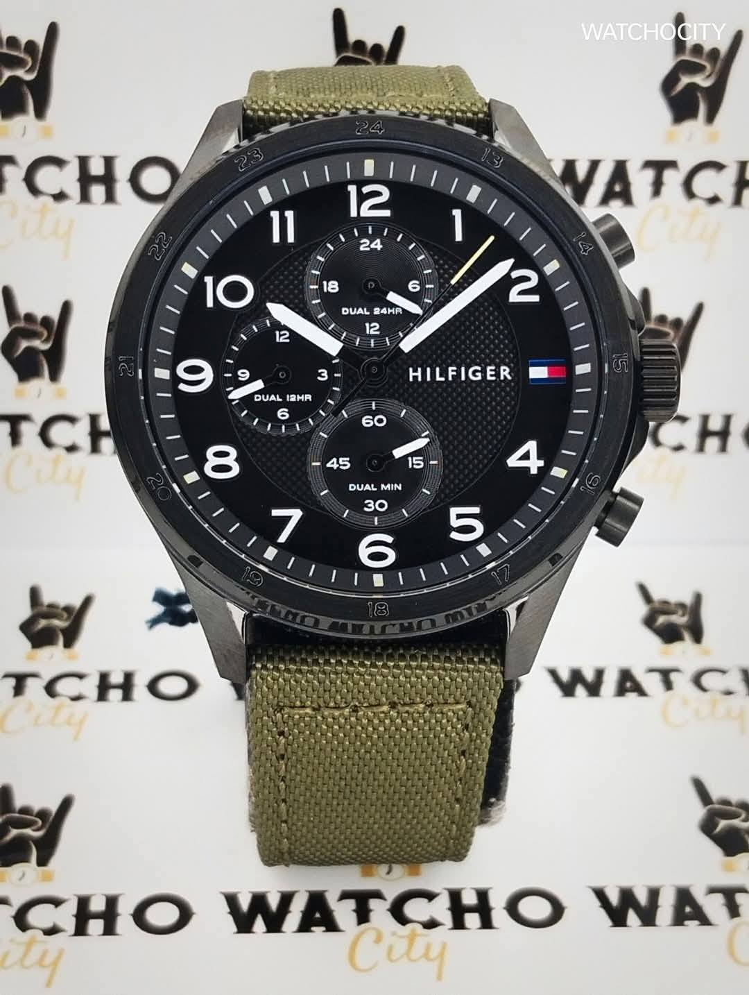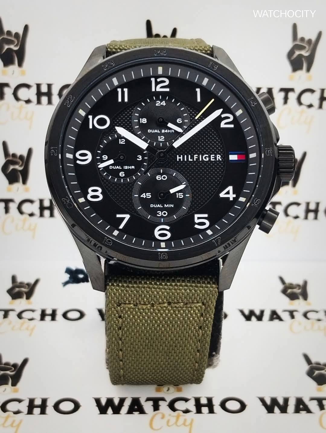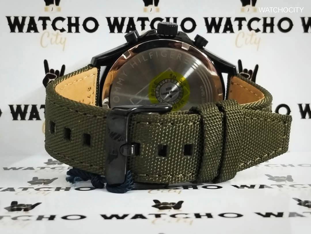 Description : Circle item shape , Crystal mineral dial window material type , Analog display type , Pin closure buckle clasp type , Nylon band material , Strap band type , Solid case back , Stainless steel case material , Men’s standard band length , Military Green band color , Black dial color , Black case color , Pull / Push crown , Luminescent hand index & small arabic numeral dial markers , Minute markers around the outer rim , Stainless steel bezel material , Fix bezel , [45]mm case diameter , [13]mm case thickness , [22]mm band width , Chronograph / Dual Timer / Hour / Minute / Second , Water resistance [5ATM] , Water resistant to [50METERS] [165FEET] in general : withstands splashes or brief immersion in water , but not suitable for swimming or bathing .