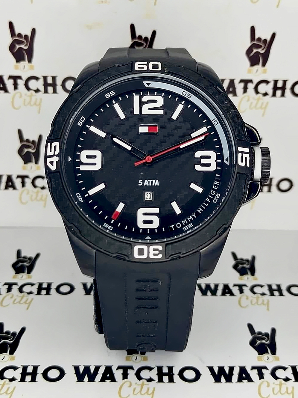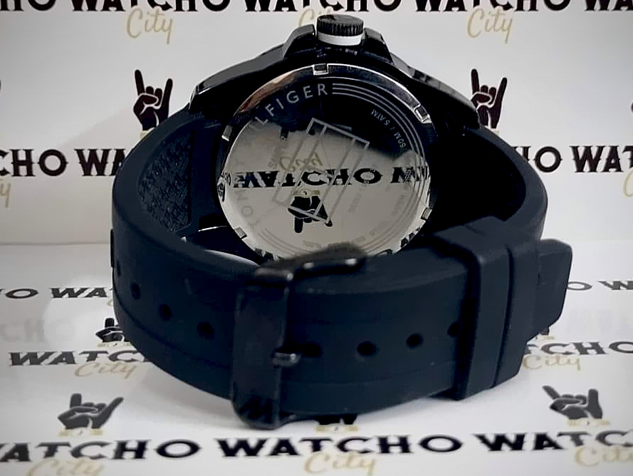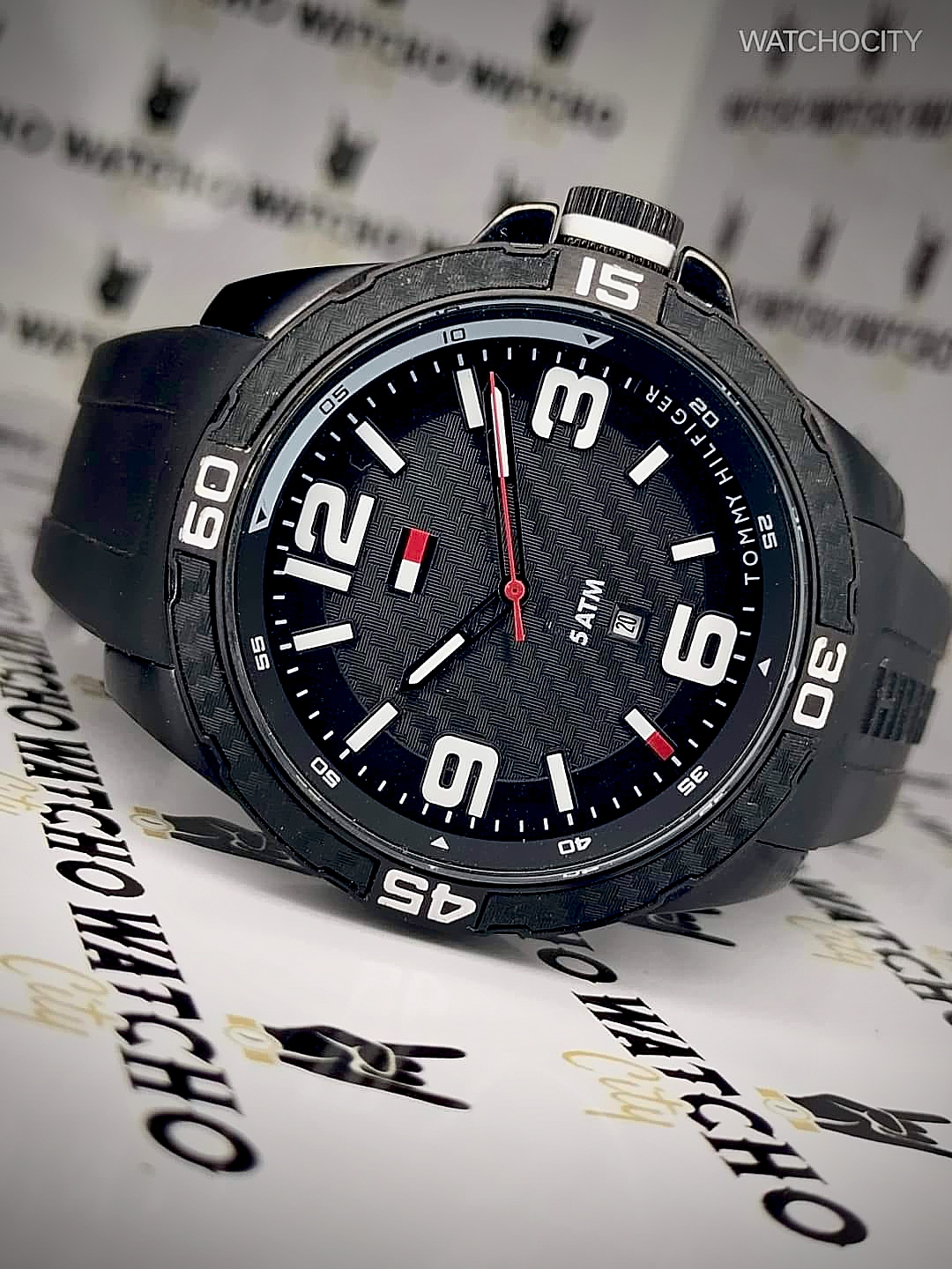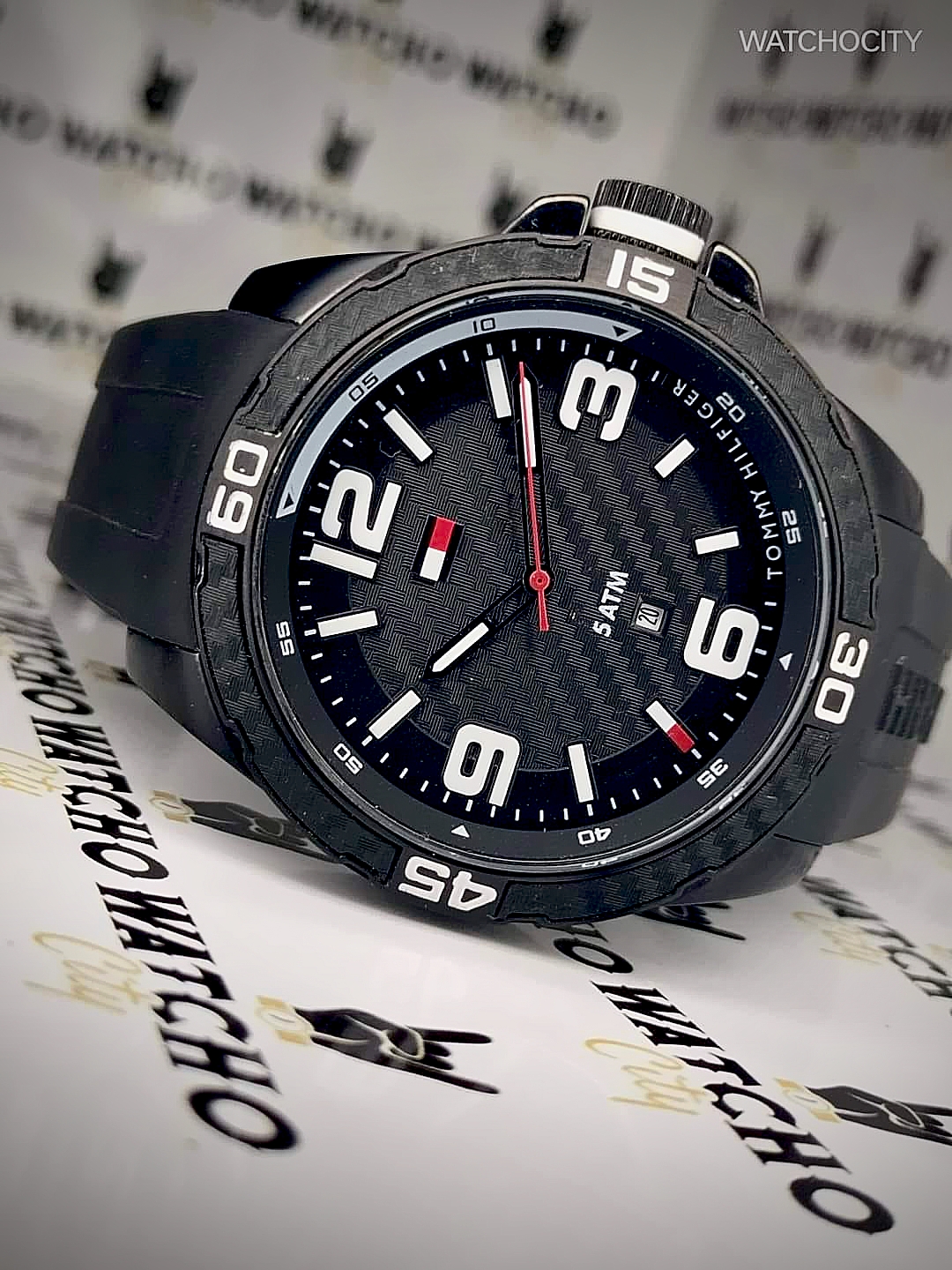 Description : Round item shape , Crystal mineral dial window material type , Analogue display type , Pin closure buckle clasp type , Silicone band material , Rubber band type , Solid screw case back , Stainless steel case material , Men’s standard band length , Black band color , Black dial color , Pull / Push crown , Luminescent black carbon index & roman numeral dial markers , Minute markers around the outer rim , Stainless steel bezel material , Fix bezel , [45]mm case diameter , [11]mm case thickness , [22]mm band width , Guilloche pattern dial / Date / Hour / Minute / Second , Date calendar indicate between [6 o’clock in position] , Water resistance [5ATM] , Water resistant to [50METERS] [165FEET] in general : withstands splashes or brief immersion in water , but not suitable for swimming or bathing .