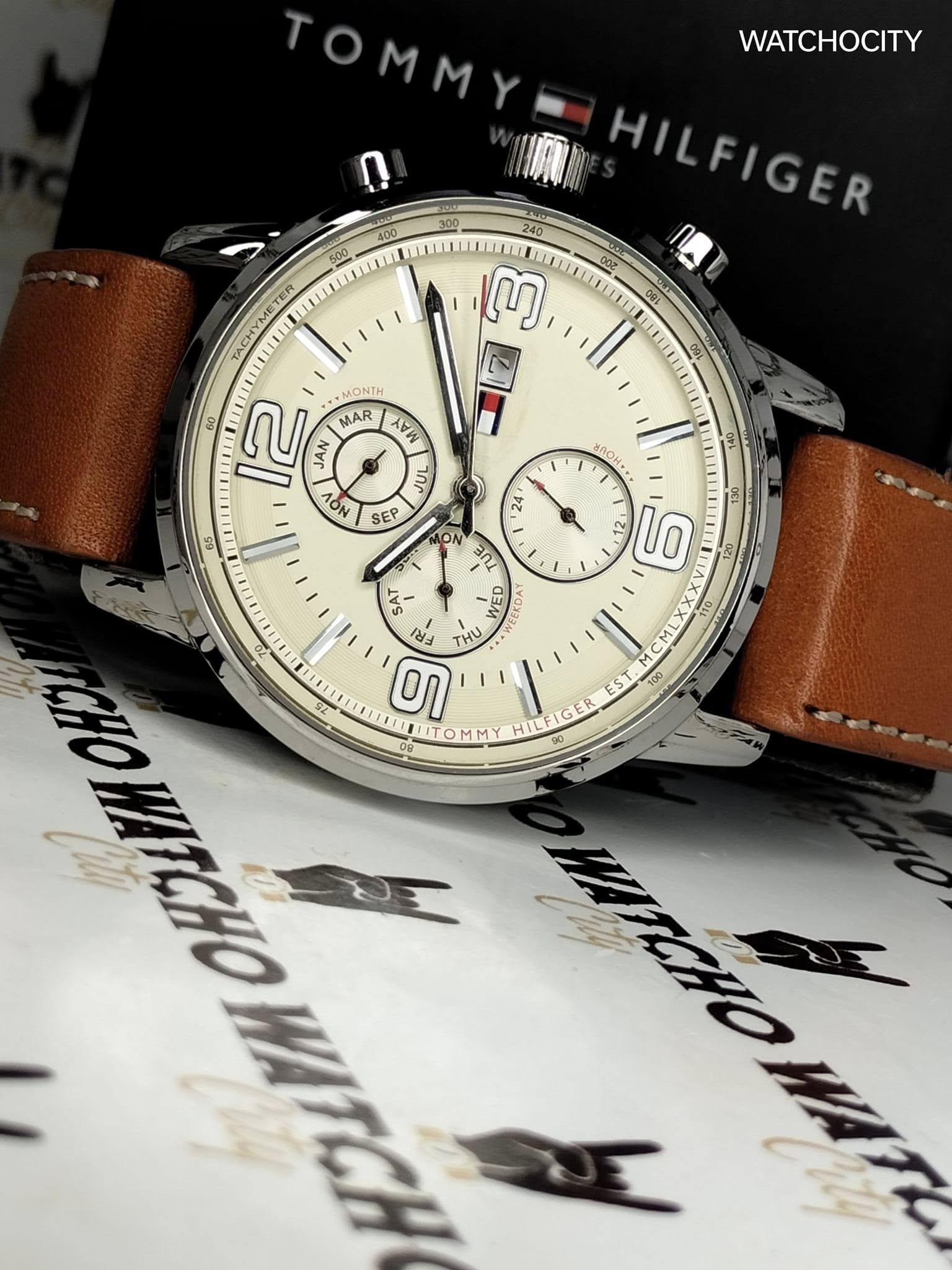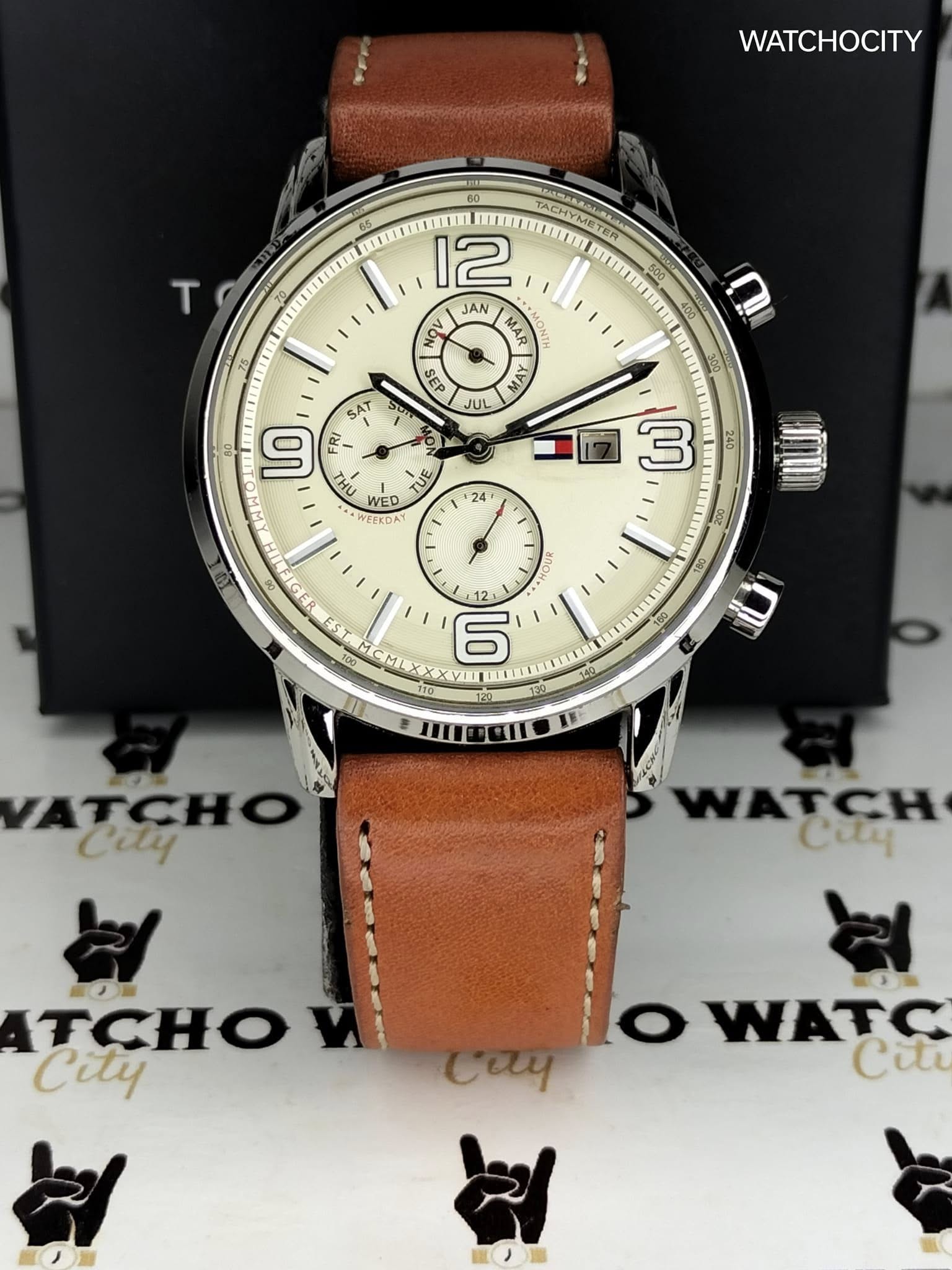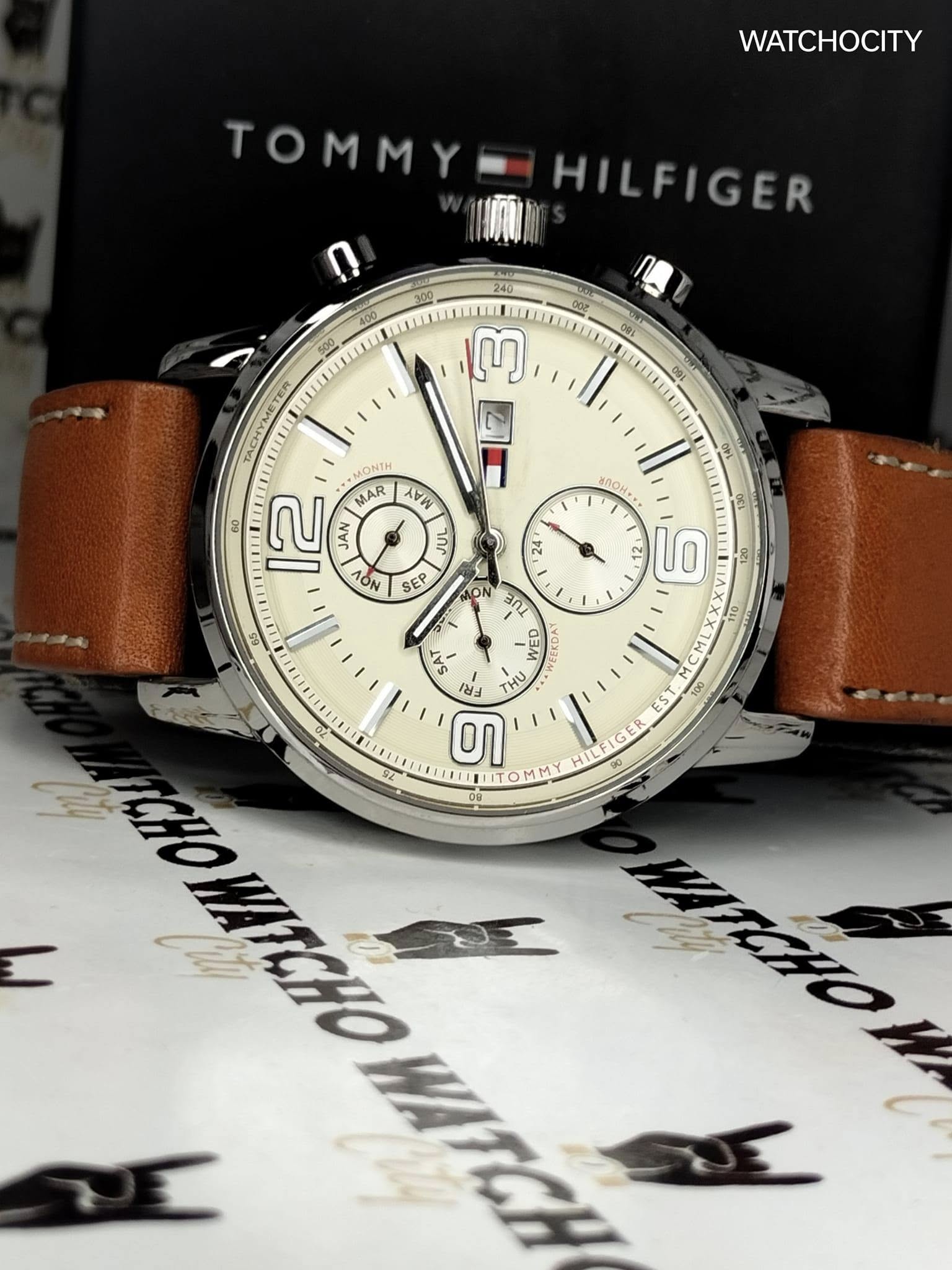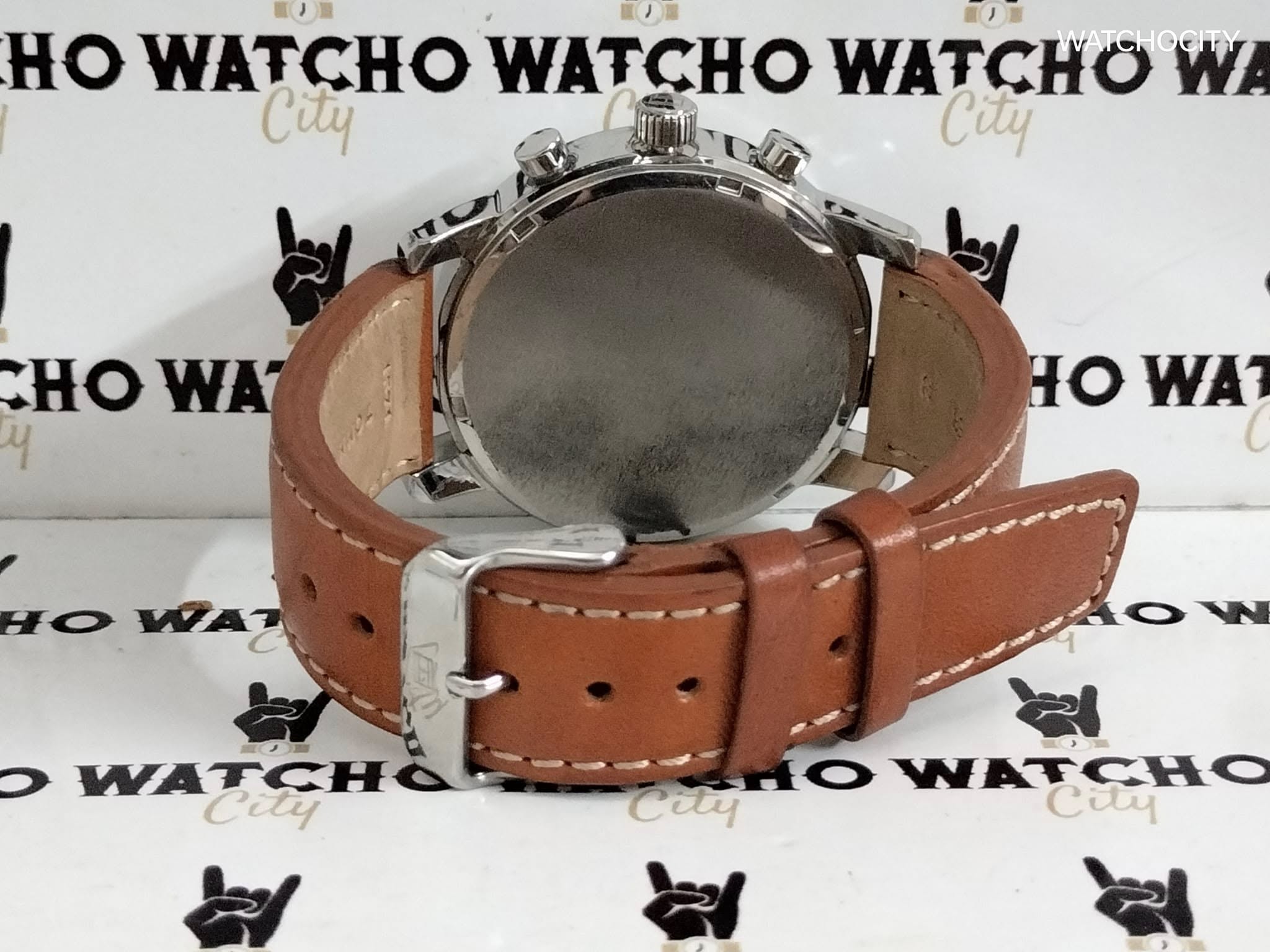 Description : Round item shape , Crystal mineral dial window material type , Cosmograph display type , Pin closure buckle clasp type , Genuine leather band material , Strap band type , Solid modified screw case back , Stainless steel case material , Men’s standard band length , Camel band color , Cream dial color , Pull / Push crown , Luminescent hands index & small arabic numeral dial markers , Minute markers around the outer rim , Stainless steel bezel material , Fix bezel , [44]mm case diameter , [10]mm case thickness , [22]mm band width , Cosmograph / Date / Hour / Minute / Second , Date calendar indicate between [3 o’clock in position] , Water resistance [3ATM] , Water resistant to [30METERS] [100FEET] in general : withstands splashes or brief immersion in water , but not suitable for swimming or bathing .